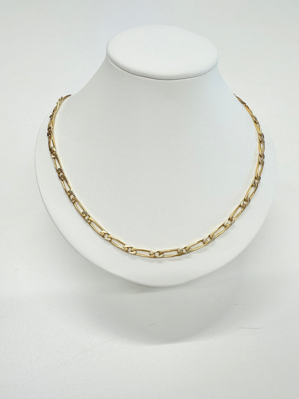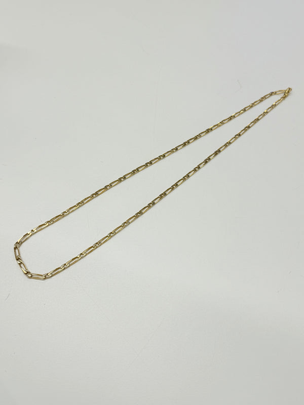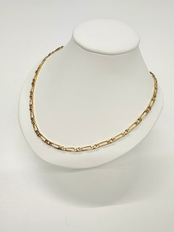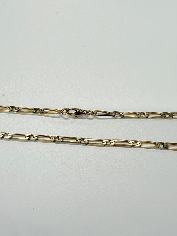Longue chaîne en maille figaro, conçue en or jaune et blanc 18 carats (750/1000). D’une longueur de 60 cm, elle offre une finesse remarquable avec une largeur de 0,3 cm et une épaisseur de 0,1 cm. Dotée d’un fermoir mousqueton pratique et poinçonnée avec la Tête d’Aigle, elle garantit qualité et authenticité. Son poids de 23,32 grammes et son état excellent font de cette chaîne un bijou d’exception, parfait pour les amateurs de sophistication intemporelle.