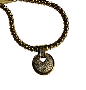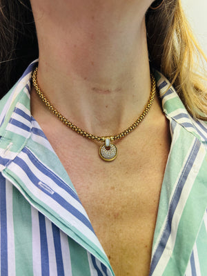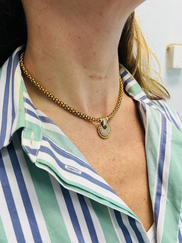 Collier maillon tubulaire en or jaune 18 carats (750/1000) centré d'un disque pavé de diamants brillantés, bélière rehaussée d'une ligne de diamants baguettes