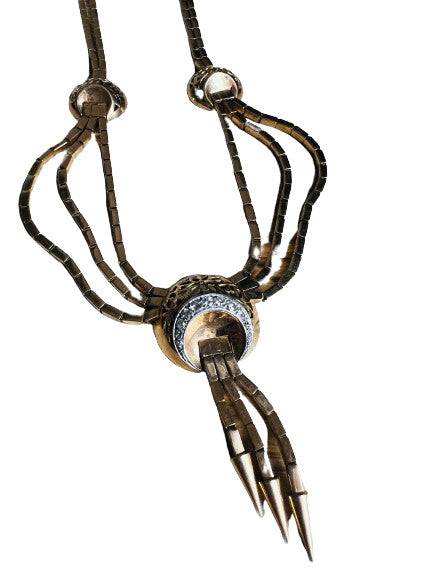 Collier en or jaune 750 et platine 850 à maillons briquettes double rang, puis triple rang, agrémentés de motif demi lune ajourés, celui du centre orné de diamants retenant 3 pampilles