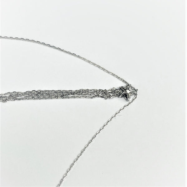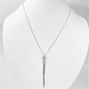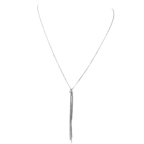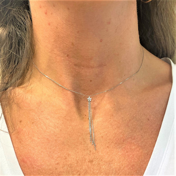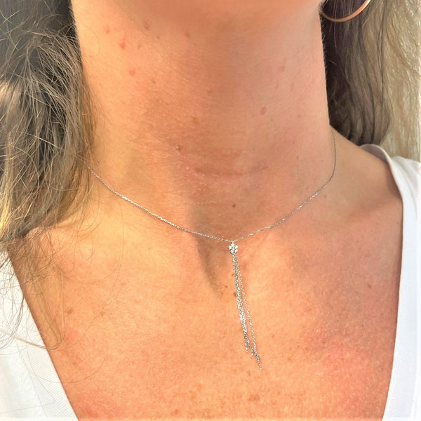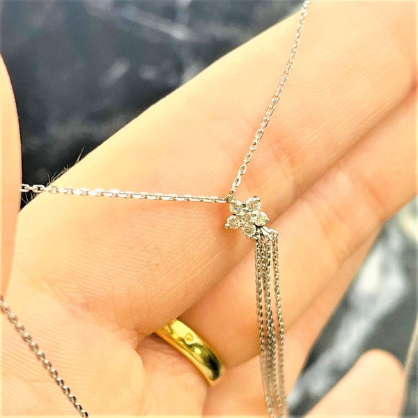 Rien de plus chic et élégant que ce ravissant collier en or blanc accompagné de son pendentif en chute diamanté. Parfait pour habiller votre cou pour les soirées chics ou simplement pour votre vie de tous les jours.