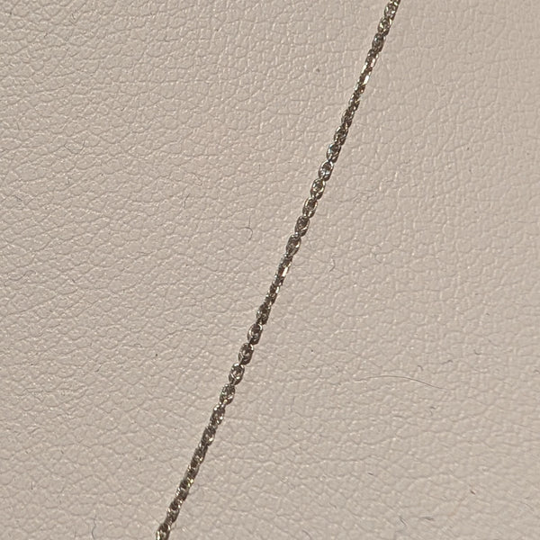 Collier princesse en or blanc 750/1000, maille forçat, fermoir à anneau ressort, poinçon 750, poids 2,70 g, longueur 40 cm, largeur 0,5 cm, épaisseur 0,5 cm, orné d’une perle naturelle et de 17 éclats de diamant, très bon état.