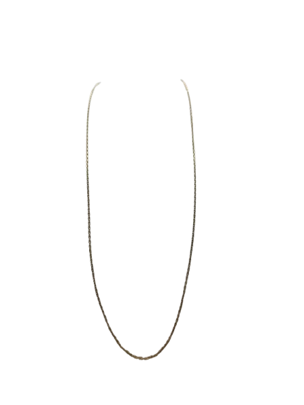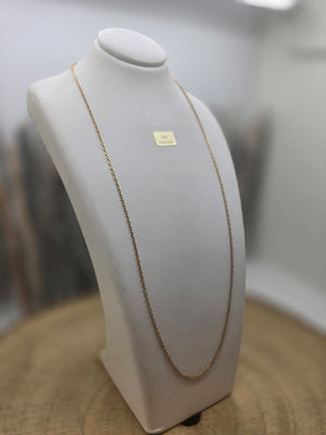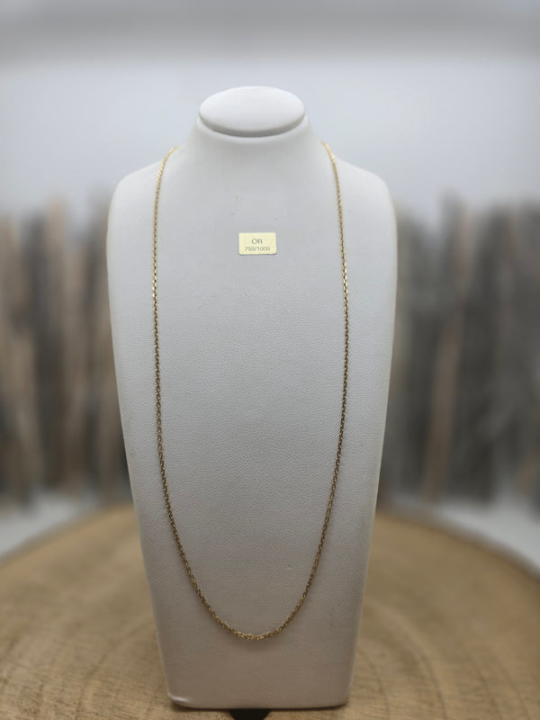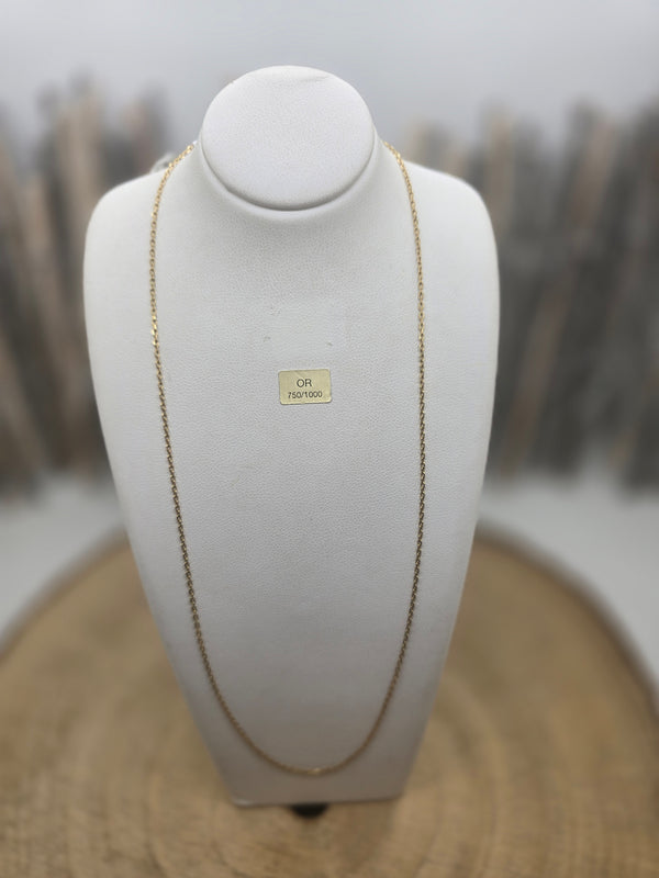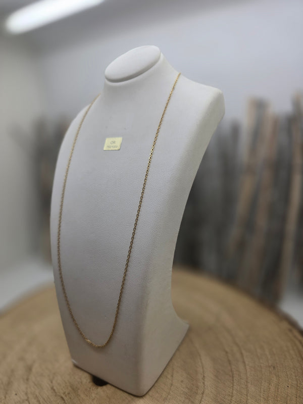 Collier de type princesse est en or jaune 18 carats (titrage 750/1000), sans poinçon. Il est composé d’une maille forçat fine, mesurant 24 cm de longueur, 1 mm de largeur et 1 mm d’épaisseur, pour un poids de 2,46 grammes. Équipé d’un fermoir à anneau ressort, il ne contient pas de pierres et se trouve en bon état.