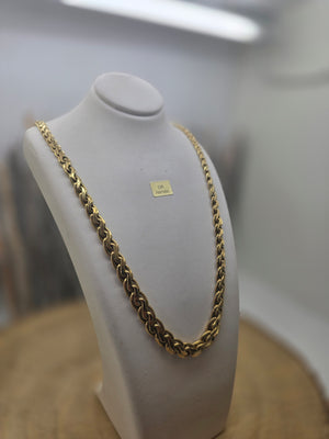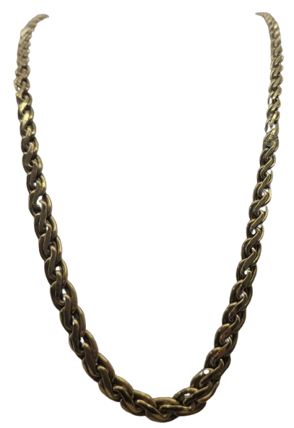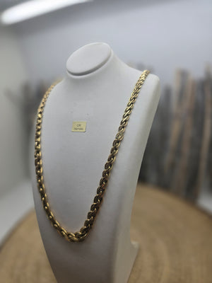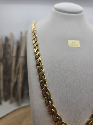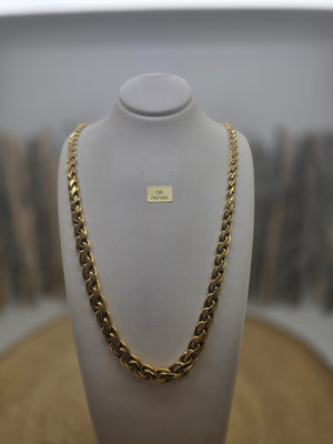 Collier ras du cou en or jaune 18 carats (titrage 750/1000, poinçon tête d’aigle) présente une maille américaine au design affirmé. Il mesure 17 cm de long, avec une largeur de 1 cm et une épaisseur de 1,2 cm, pour un poids de 16,24 grammes. Équipé d’un fermoir mousqueton, il est en très bon état.