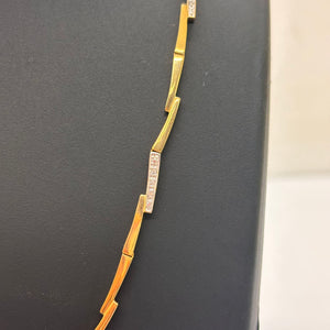 Collier ras du cou en or jaune et or blanc 18 carats (750/1000), maille bâtonnet, orné de 10 éclats de diamants. Fermoir mousqueton, poinçon Tête d’Aigle. Le bijou mesure 41 cm de long, 0,1 cm de large, pour un poids de 11,43 grammes. État : bon.