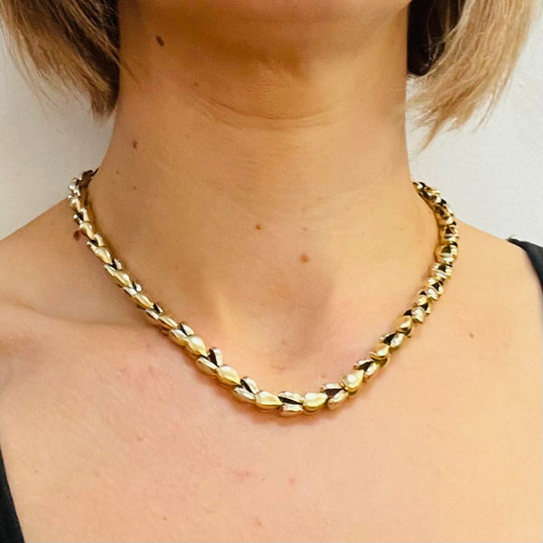 Collier ras du cou en or jaune 18 carats (750/1000) se distingue par sa maille gouttes au design élégant et structuré. Il mesure 44 cm de longueur, 6 mm de largeur et 10 mm d’épaisseur, pour un poids conséquent de 50,55 grammes. Doté d’un fermoir à cliquet sécurisé et poinçonné tête de loup, ce bijou est en bon état général.