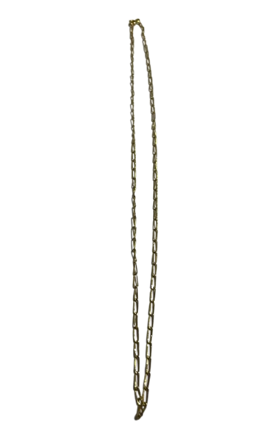 Collier sautoir en or jaune 18 carats (750/1000) avec maille cheval. Il pèse 2,18 grammes et mesure 44,5 cm de longueur, 22 cm de largeur, avec une épaisseur de 0,1 cm. Le fermoir est de type anneau ressort. Ce collier est sans pierres et en bon état.