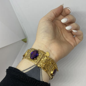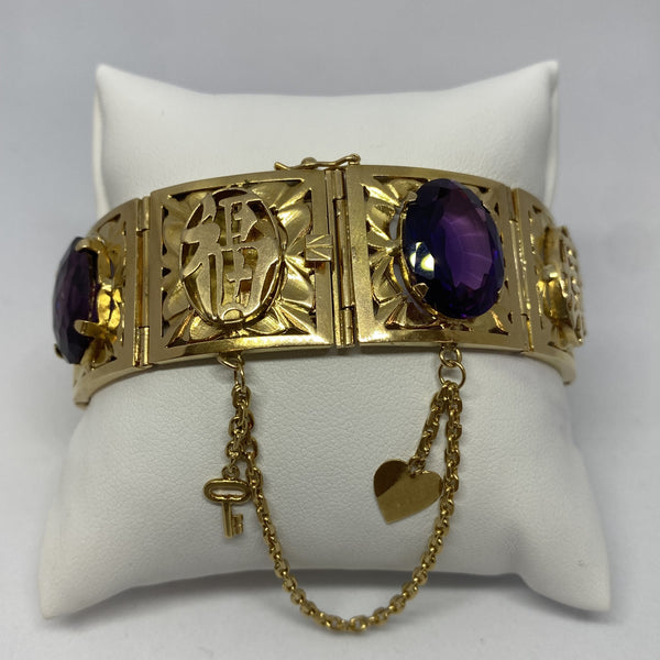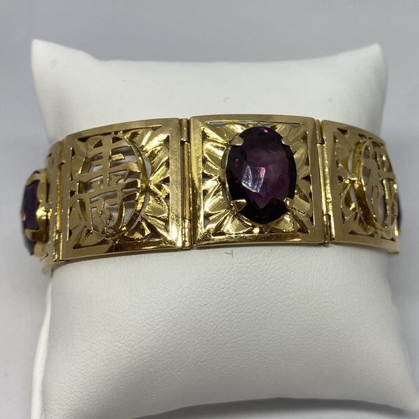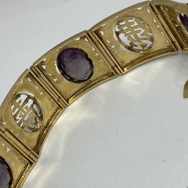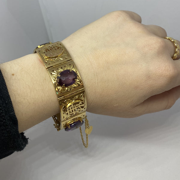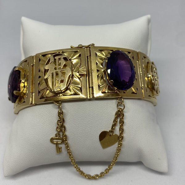 Très joli bracelet articulé en or 18k avec ces symboles chinois en relief et ces magnifiques améthystes
