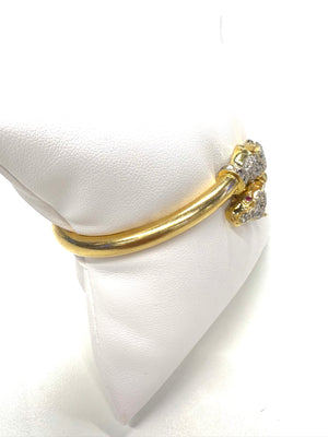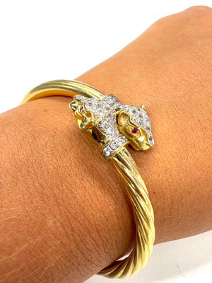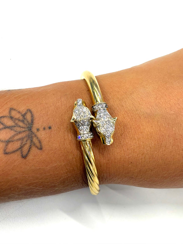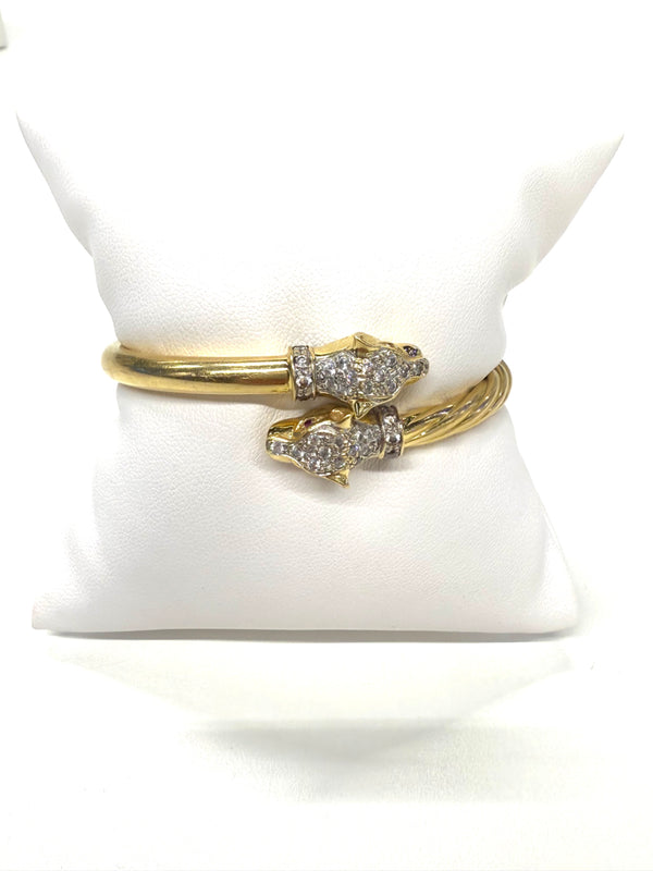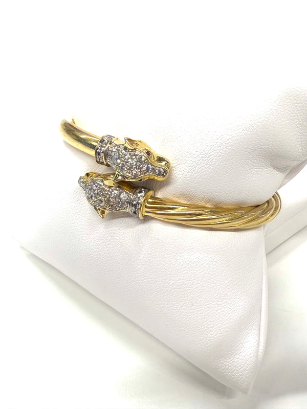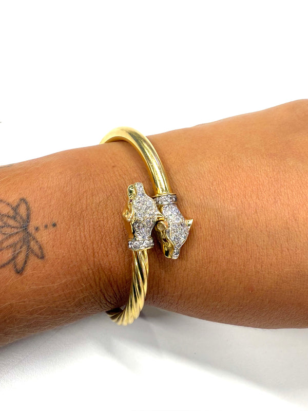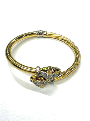 Ce somptueux bracelet jonc panthère en or jaune 18 carats (750/1000) allie puissance et élégance avec son design unique. Son contraste entre la maille torsadée d’un côté et lisse de l’autre lui confère un style raffiné et original. Avec un poids imposant de 22,76 grammes et des dimensions harmonieuses (5,5 cm de longueur, 0,5 cm de largeur et d’épaisseur), il épouse parfaitement le poignet. Sertie d’oxyde de zirconium, cette pièce apporte une touche de brillance captivante. Son fermoir discret qui se crochète derrière chaque oreille assure un maintien sécurisé.