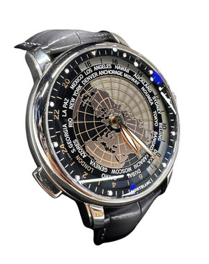 Fournis avec : Boite d'origineBracelet d'origineCertificat d'authenticité Magnifique montre Mont Blanc Star Legacy Alligator Grey Orbis Terrarum, réserve de marche 48h, aiguilles luminescentes recouverte d or rose, cadran en cristal saphir indiquant l’hémisphère nord et 24 villes des fuseaux horaires de 24 heures