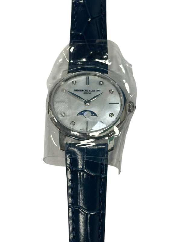 Magnifique montre Frédérique Constant avec complication Moonphase, 8 diamants et cadran Nacre. Vendue avec sa boîte, la montre est neuve