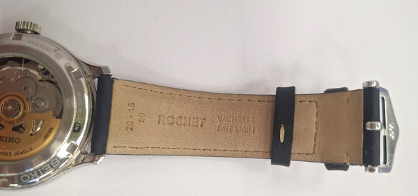 Magnifique montre présage automatique seul temps inspiré des jardins japonais monté sur un bracelet en cuir fait main de couleur bleu (assorti au cadran) vendu avec son bracelet en acier d'origine, sa boite, sa notice, et son certificat.