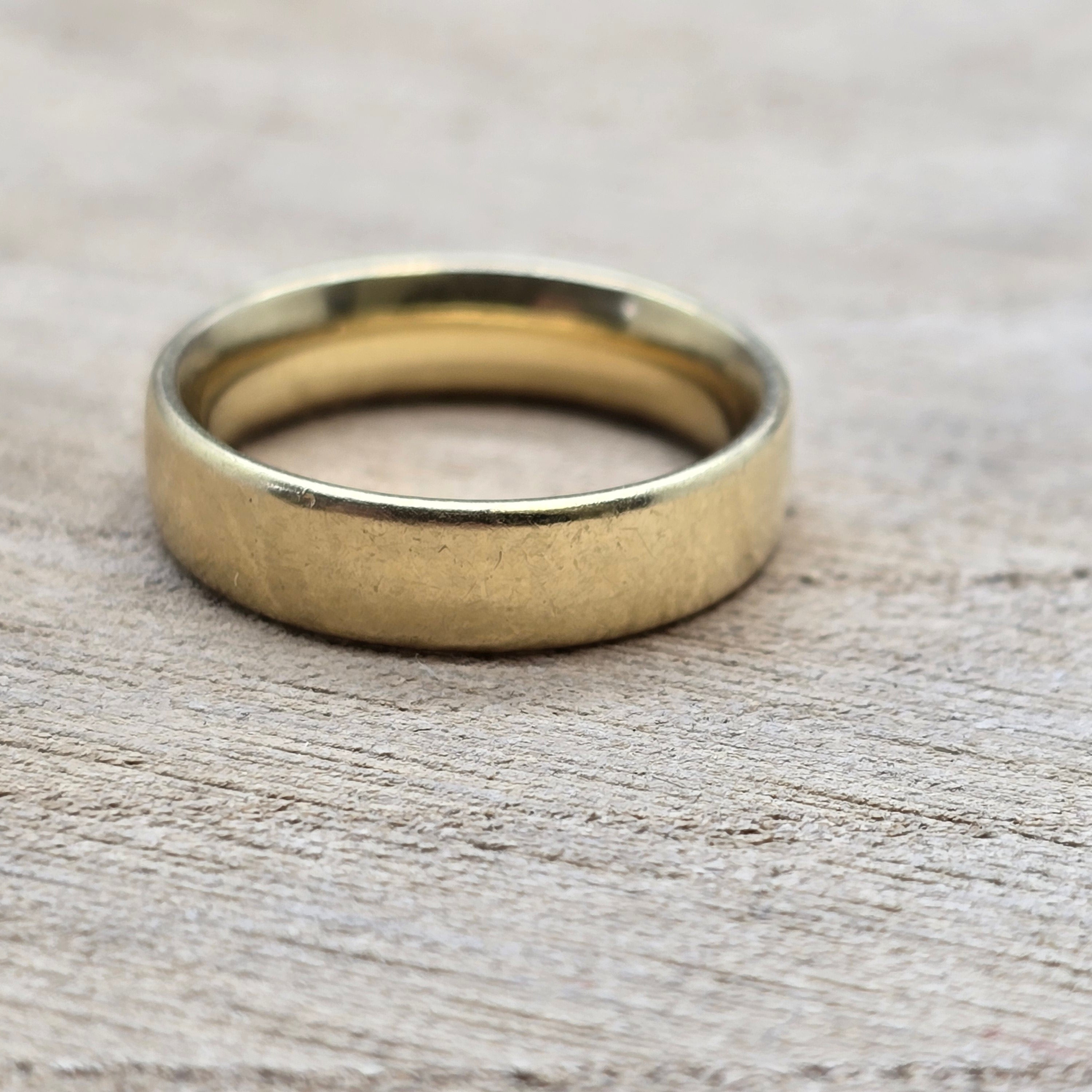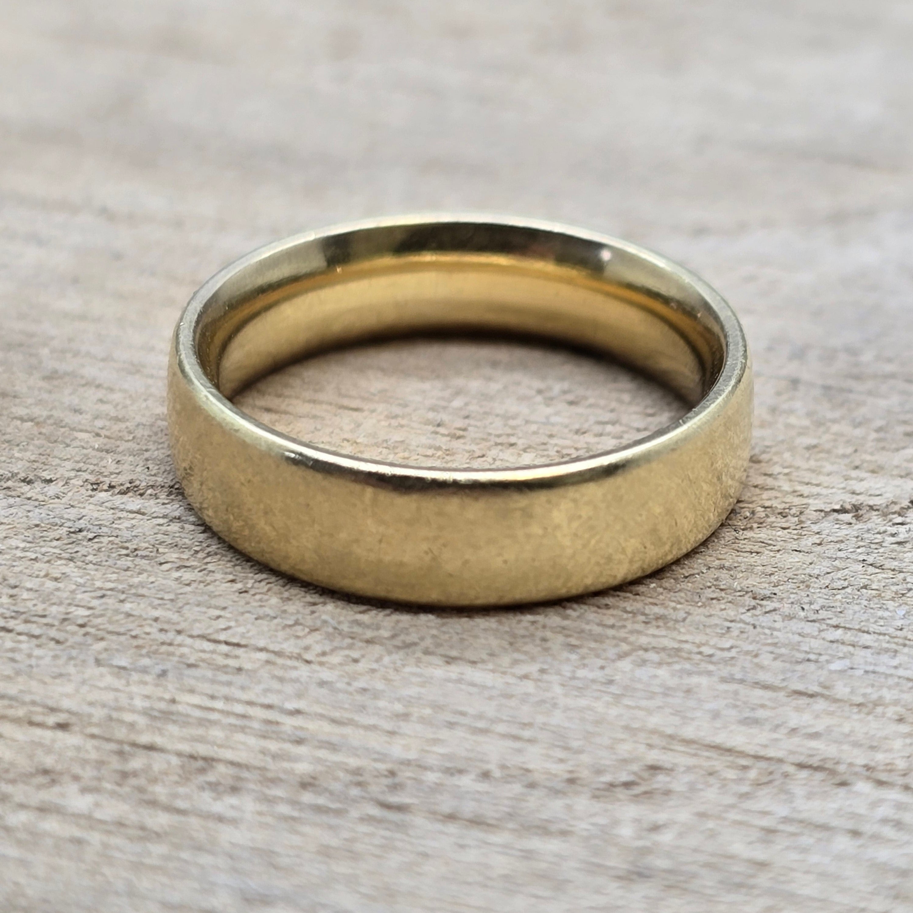 Alliance en or jaune 18 carats (750/1000), sans poinçon, affiche un poids de 6,29 grammes et une taille 52 ; elle ne comporte aucune pierre et se trouve en bon état.