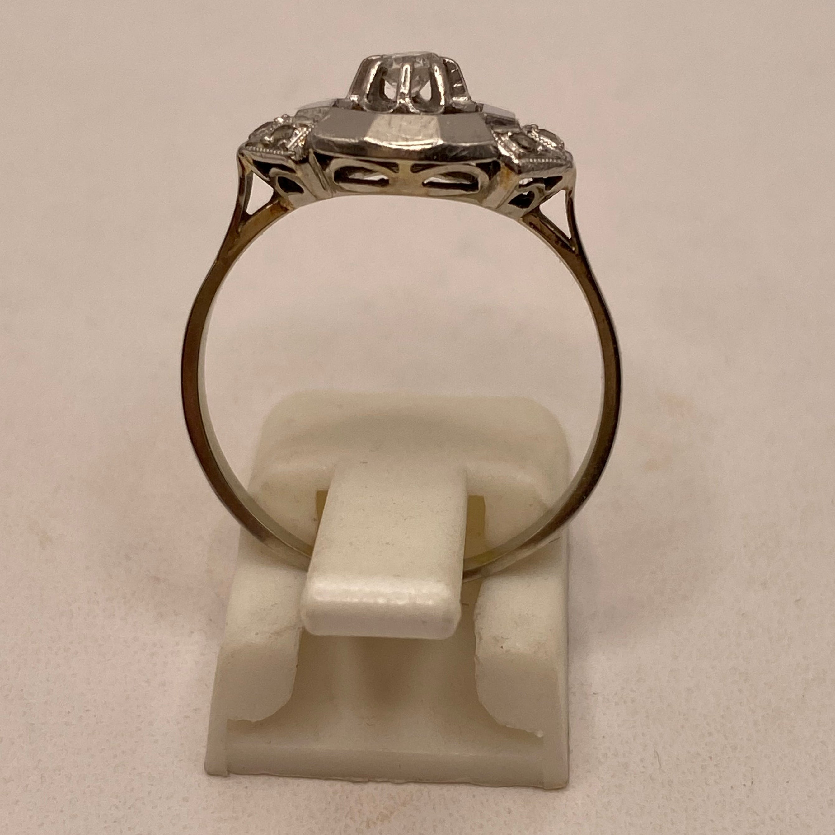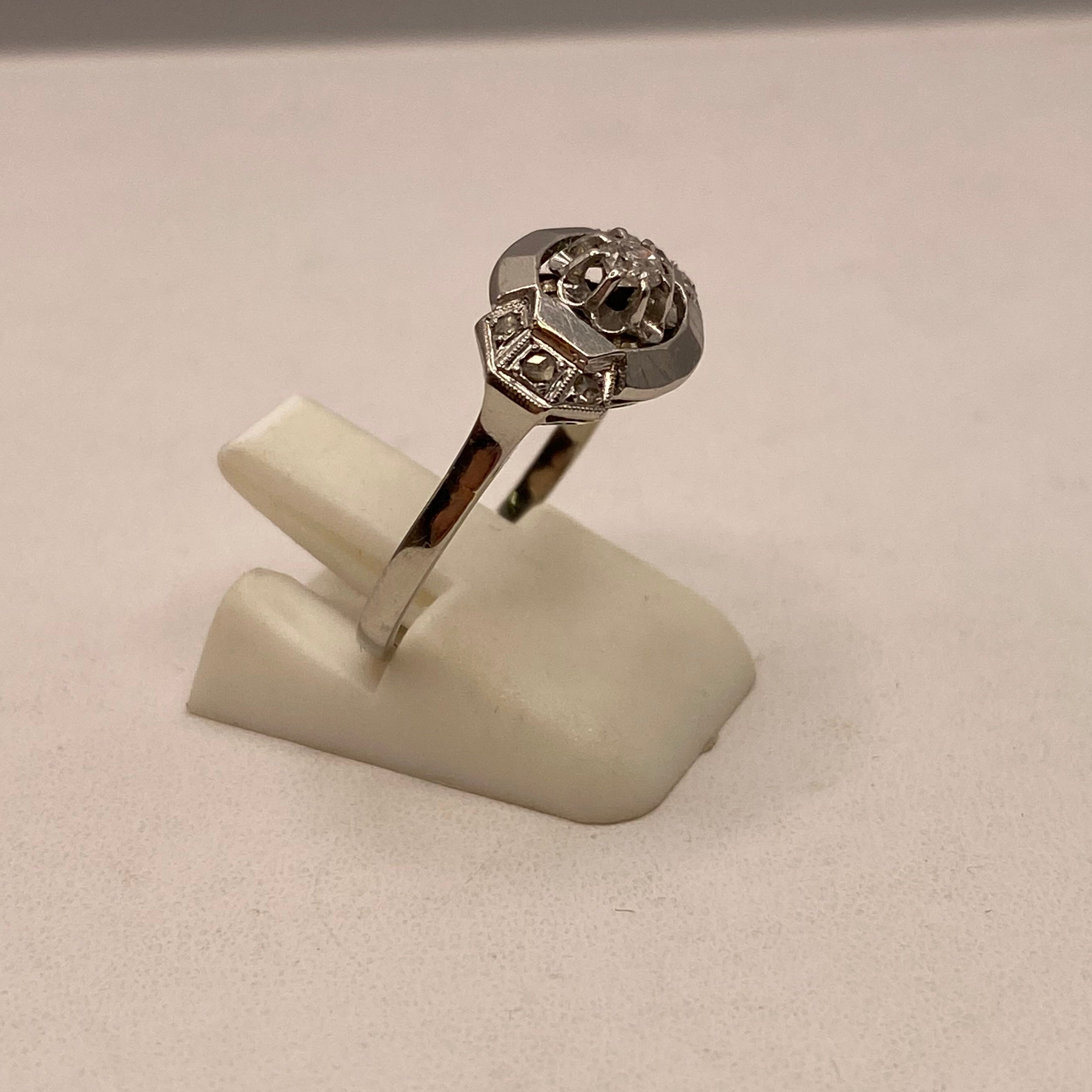 Bague ancienne en or gris 750/1000 (18 K), poinçon tête d’aigle, poids 2,31 g, taille 56. Sertie d’un diamant de 0,10 carat et de 6 roses de diamants. Modèle en très bon état.