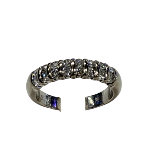 Bague empierrée est en or gris 18 carats (750/1000) et porte le poinçon tête d’aigle. Elle est sertie de 16 petits diamants de 0,1 cm chacun, pèse 5,23 grammes et correspond à une taille 54. Elle est en très bon état, à l’exception d’une gravure à l’intérieur de l’anneau.