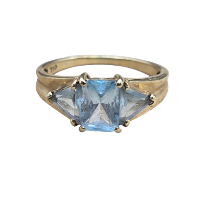 Ravissante bague empierrée en or jaune 18 carats, sertie d’une aigue-marine. Taille 50, poids 2,82 g. Élégante et lumineuse, en très bon état.