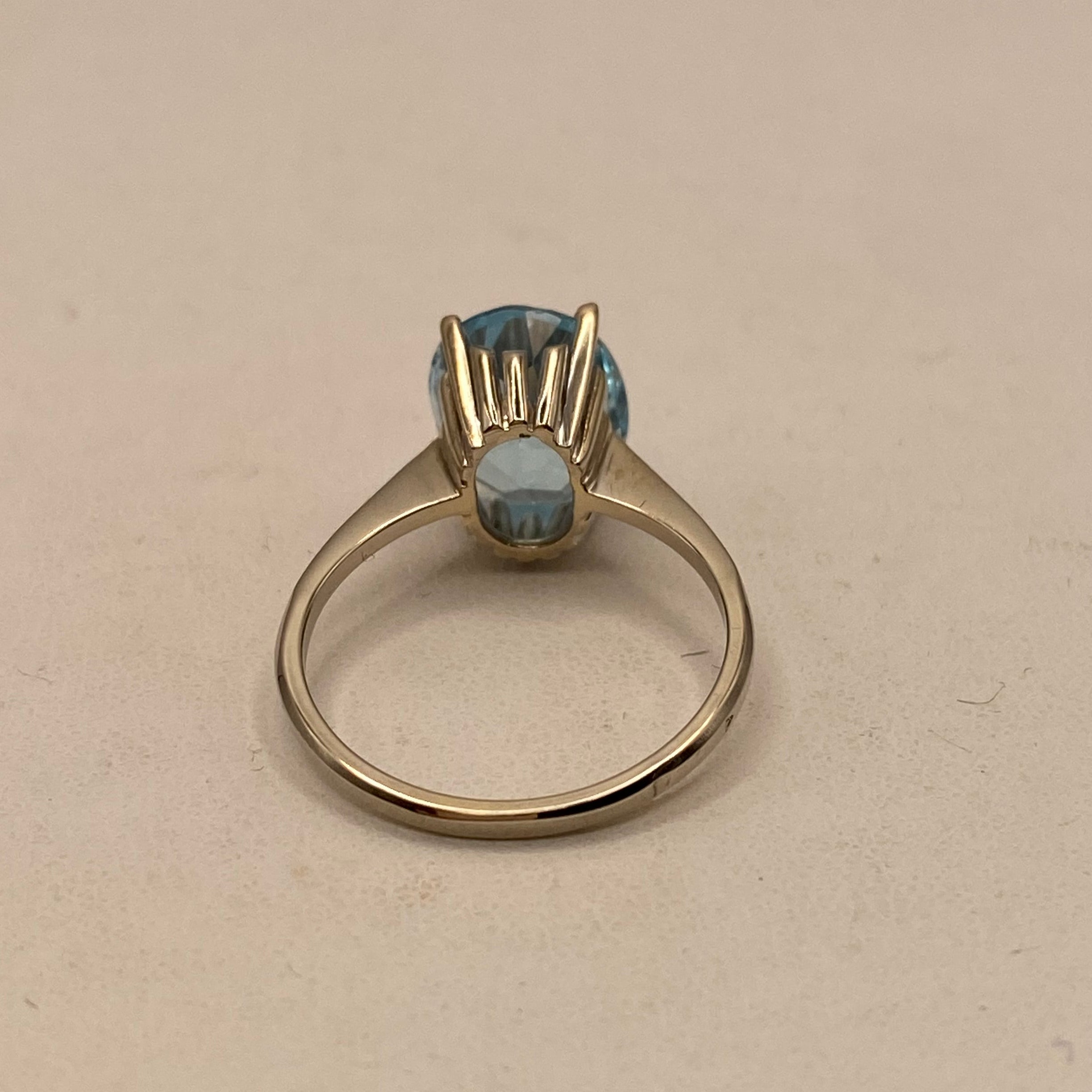 Élégante bague en or blanc 750/1000, ornée d’une belle topaze bleue ovale (0,9 x 1,1 cm).
