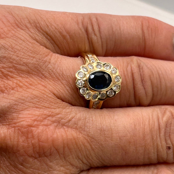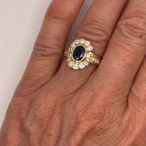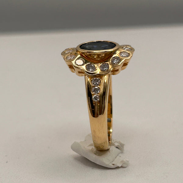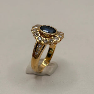 Bague empierrée en or jaune 18 carats (750/1000), poinçonnée Tête d’Aigle. Elle est sertie d’un saphir bleu central non rayé, entouré de 14 diamants brillants, complétés par 6 diamants brillants latéraux. Taille 54. Poids total : 6,37 grammes. État : Très bon.