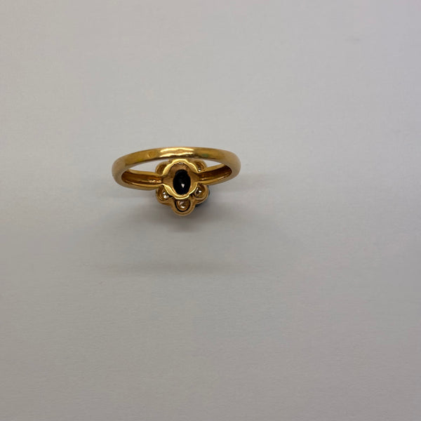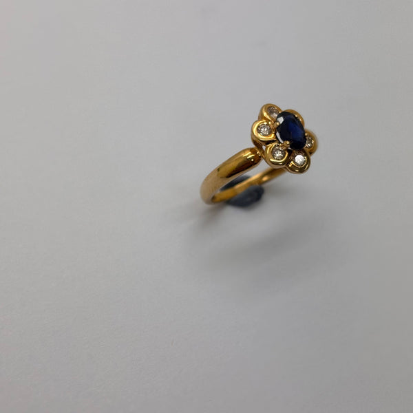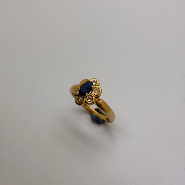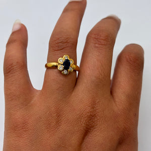 Magnifique bague en or jaune 18 carats (750/1000), ornée d’un saphir central de belle taille encadré par six petits diamants.
