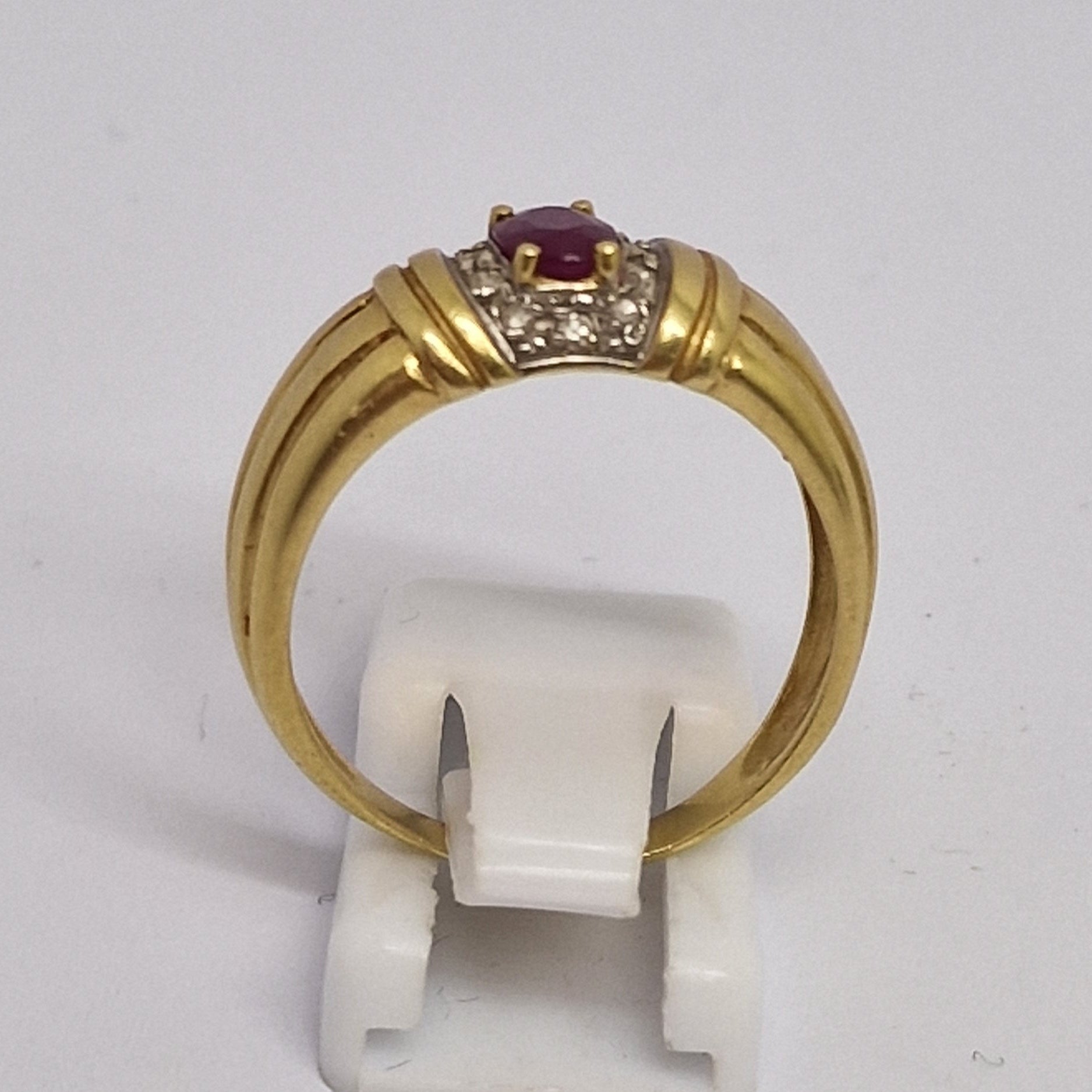 Bague empierrée en or jaune 18 carats (750/1000), poinçonnée “Tête d’Aigle”. Poids : 5,43 g – Taille : 60. Sertie de diamants et rubis, elle se présente en très bon état.