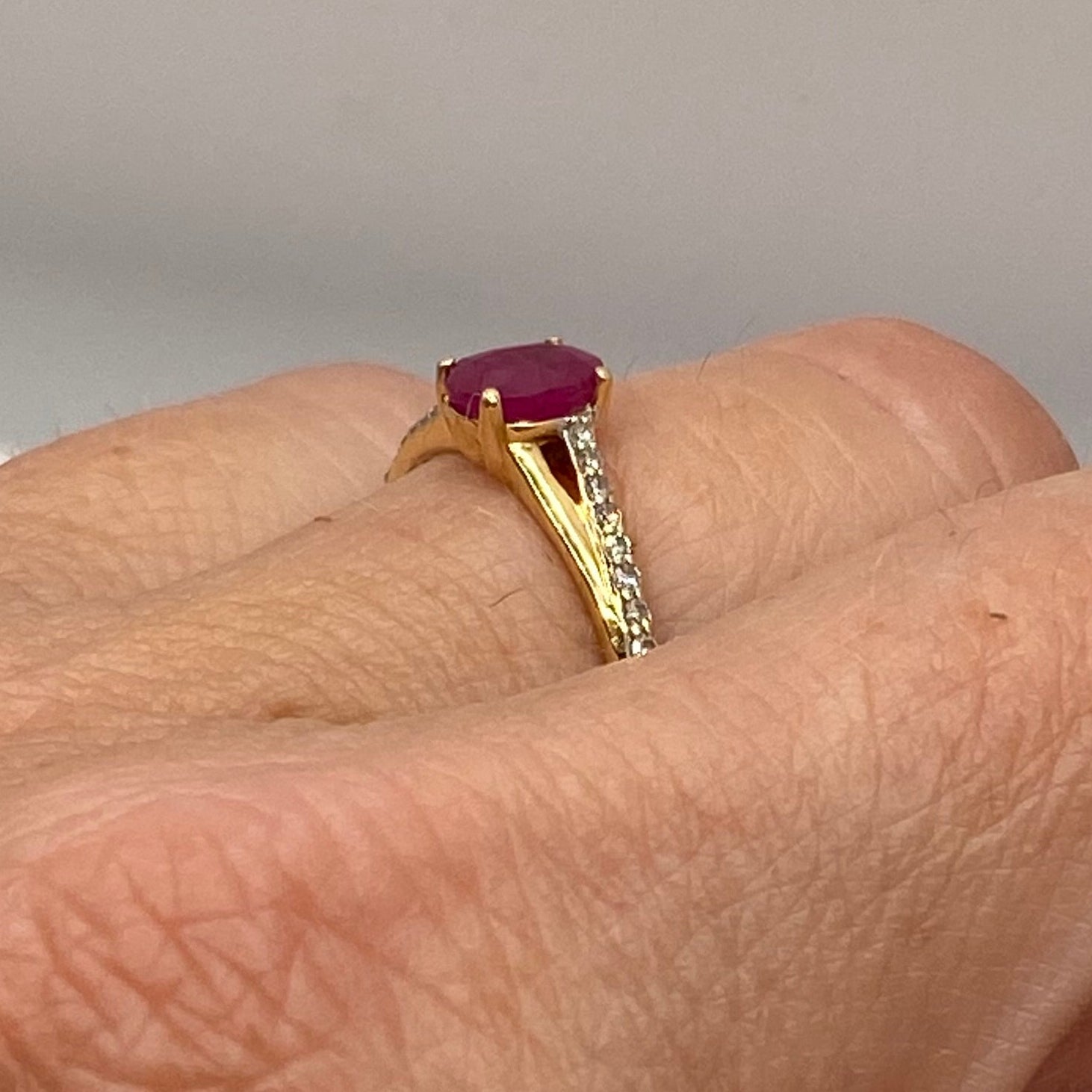 Bague empierrée en or jaune 750/1000 (18 K), poinçon 750, poids 1,54 g, taille 51. Sertie d’un rubis et de 16 petits diamants. Modèle en bon état.