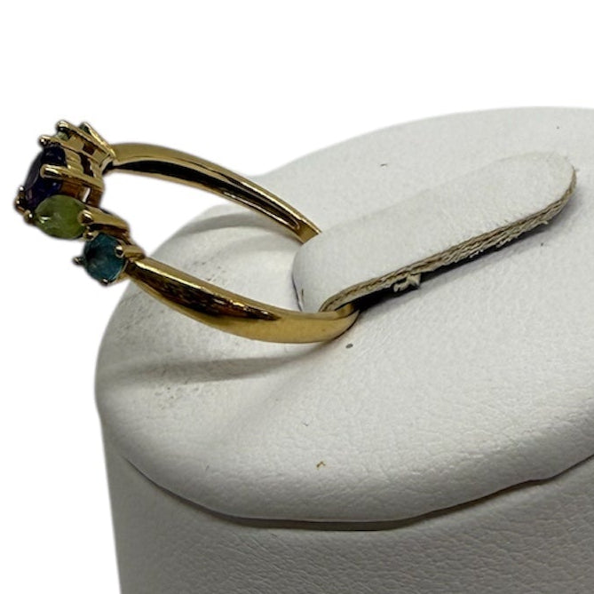 Bague demi-tour en or jaune 750/1000, poinçonnée 750, au poids de 1,72 g, sertie d’une améthyste de 0,10 ct, de deux pierres naturelles vertes et de deux spinels bleus (0,05 ct chacun). En taille 52 et en très bon état, elle offre un jeu de couleurs élégant et lumineux, idéal pour apporter une touche raffinée à toute collection.