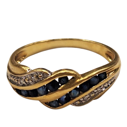 Bague empierrée en or jaune et or blanc 18 carats (750), ornée de 12 saphirs bleus (0,02 ct chacun) et de 4 diamants (0,01 ct chacun). Poids : 2,62 g – Taille 53. Poinçon de bijouterie. Très bon état.