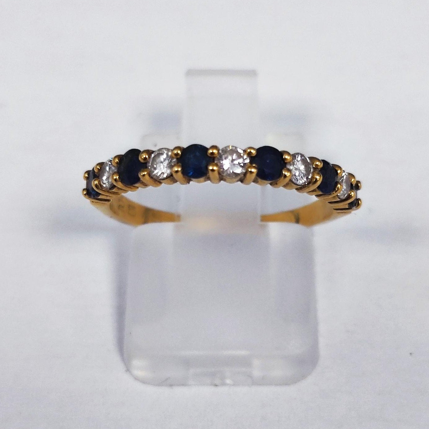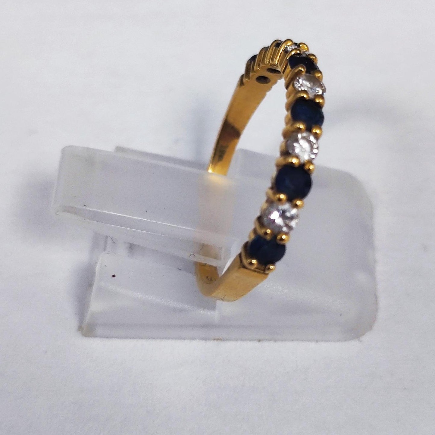 Bague Demi-Tour en or jaune 750/1000 (18 carats), poinçon Tête d’Aigle, poids 1,96 g, taille 53. Sertie de 5 diamants de 0,02 ct et de 6 saphirs naturels, elle offre un contraste lumineux entre éclat et couleur. En bon état.