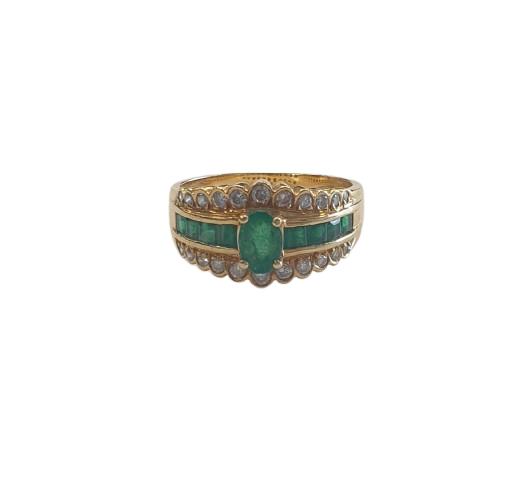 Bague empierrée en or jaune 18 carats, marquée d’un poinçon étranger, pèse 5,73 grammes et correspond à une taille 53 ; elle est sertie de 22 diamants de 1 mm, de 8 émeraudes de 1,8 mm et d’une émeraude centrale de 4 mm, le tout dans un bon état général.
