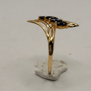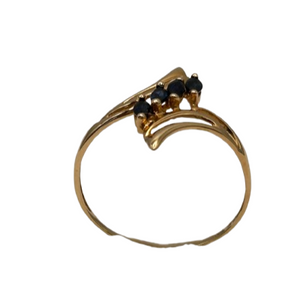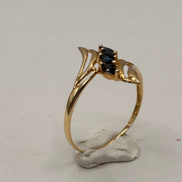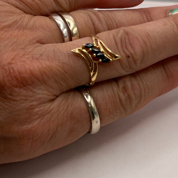 Bague empierrée en or jaune 18 carats (750/1000) porte le poinçon tête d’aigle. Légère avec un poids de 1,57 gramme, elle est de taille 61. Elle est ornée de 4 saphirs taillés en navette et se présente en très bon état.
