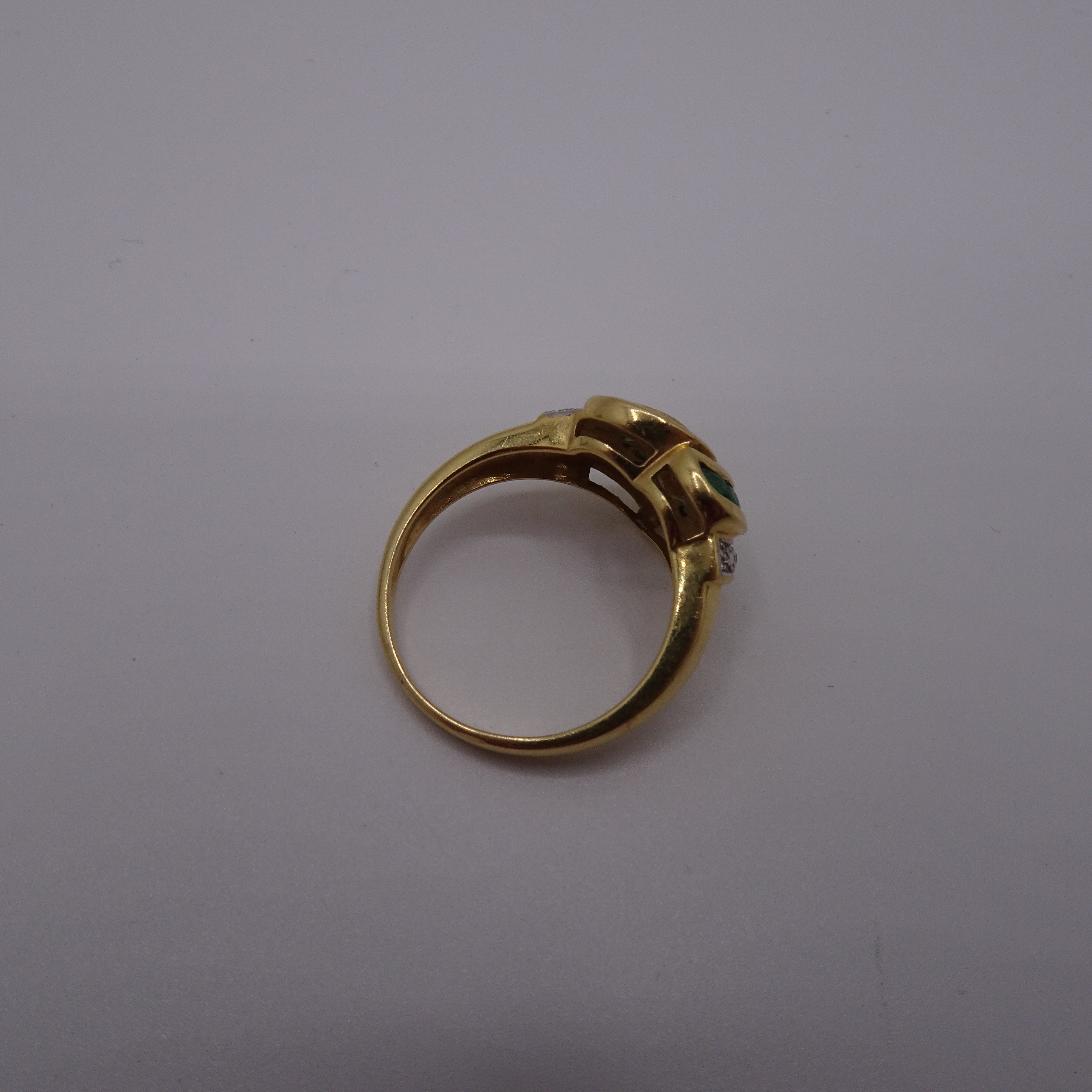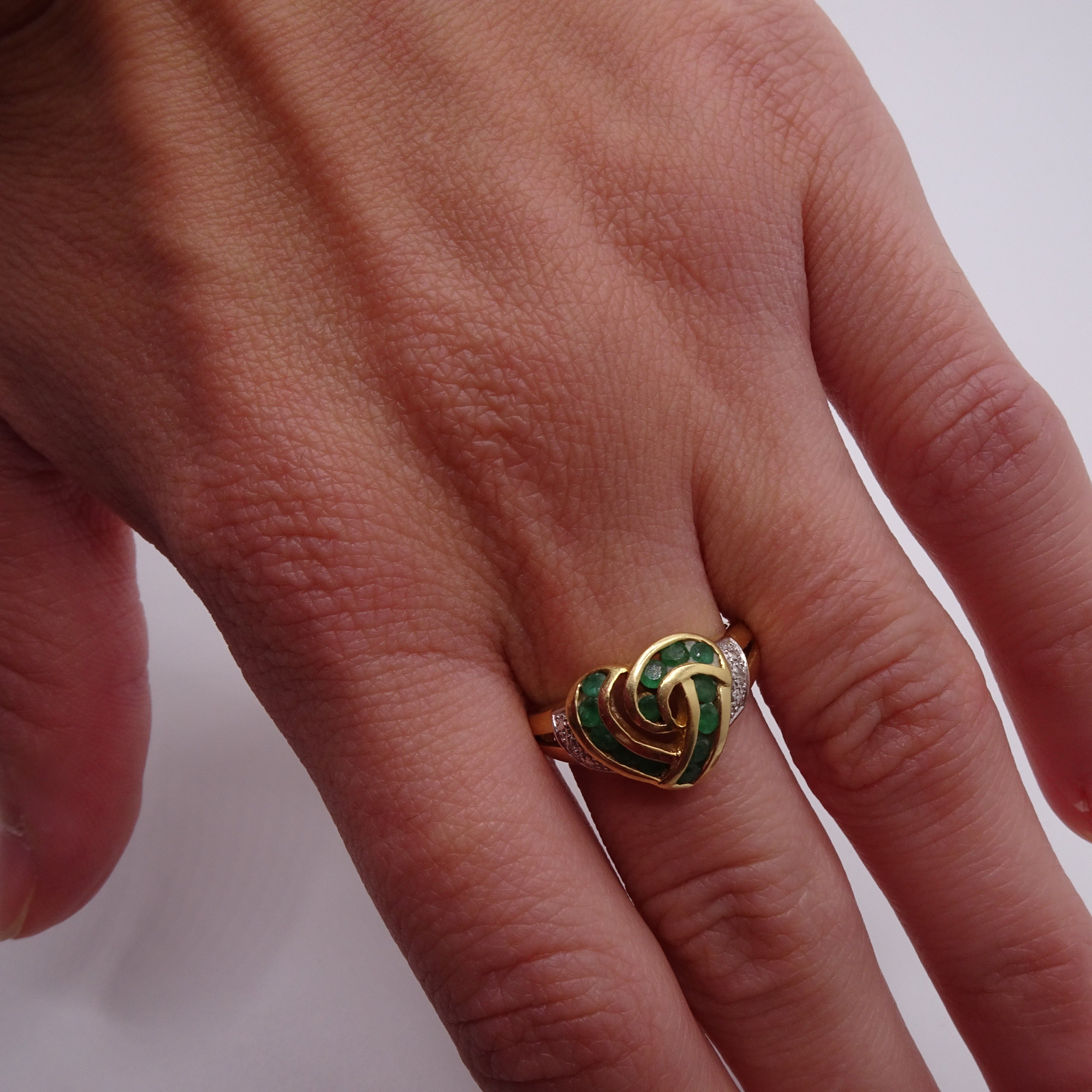 Bague empierrée en or jaune 18 carats (poinçon tête d’aigle 750/1000), ornée de treize pierres d’aventurine et de deux diamants de 0,005 carat chacun. Elle pèse 4,50 grammes et est de taille 55. Ce bijou est en très bon état.