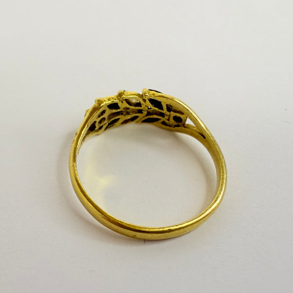 Bague en or jaune 18 carats (750/1000), ornée de 8 pierres : diamants et saphir. Taille 57, poids 2,36 g. Très bon état.