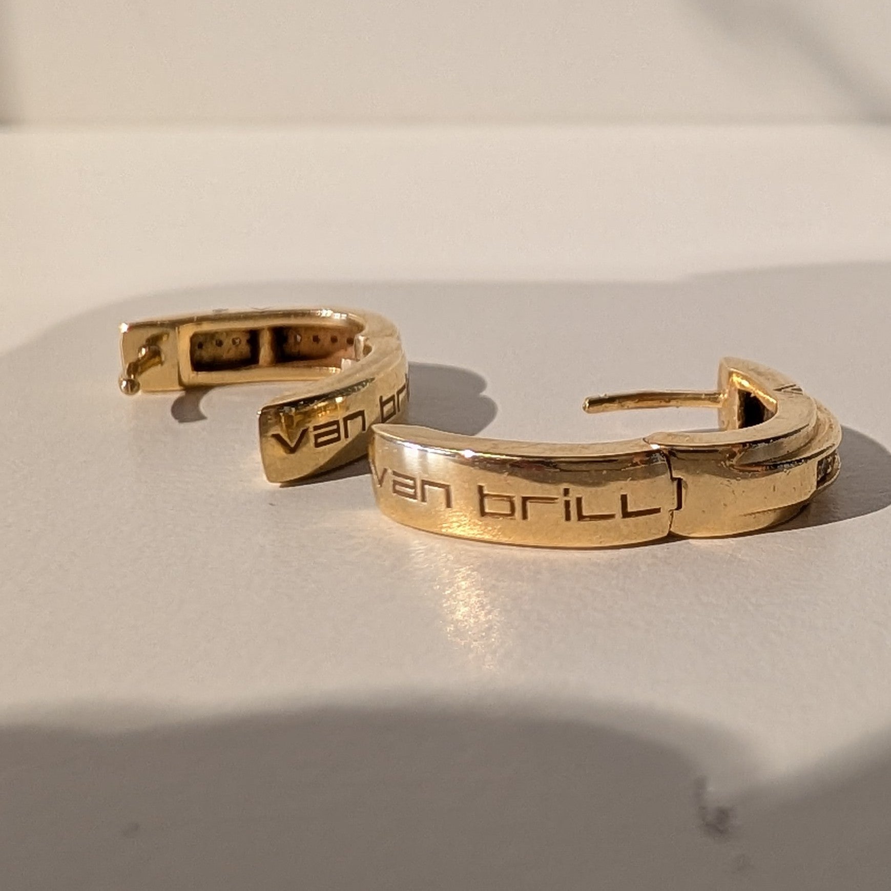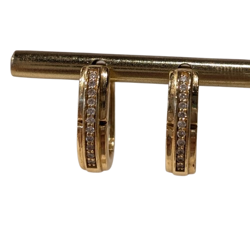 Boucles d’oreilles de type créoles/demi-créoles en or jaune 18 carats (750/1000), sans poinçon, dotées d’un fermoir à cliquet. Chaque boucle mesure 1,5 cm de hauteur et de largeur, pour une épaisseur de 0,5 cm. Le tout pèse 5,90 grammes et est orné de 24 diamants. L’ensemble est en très bon état.