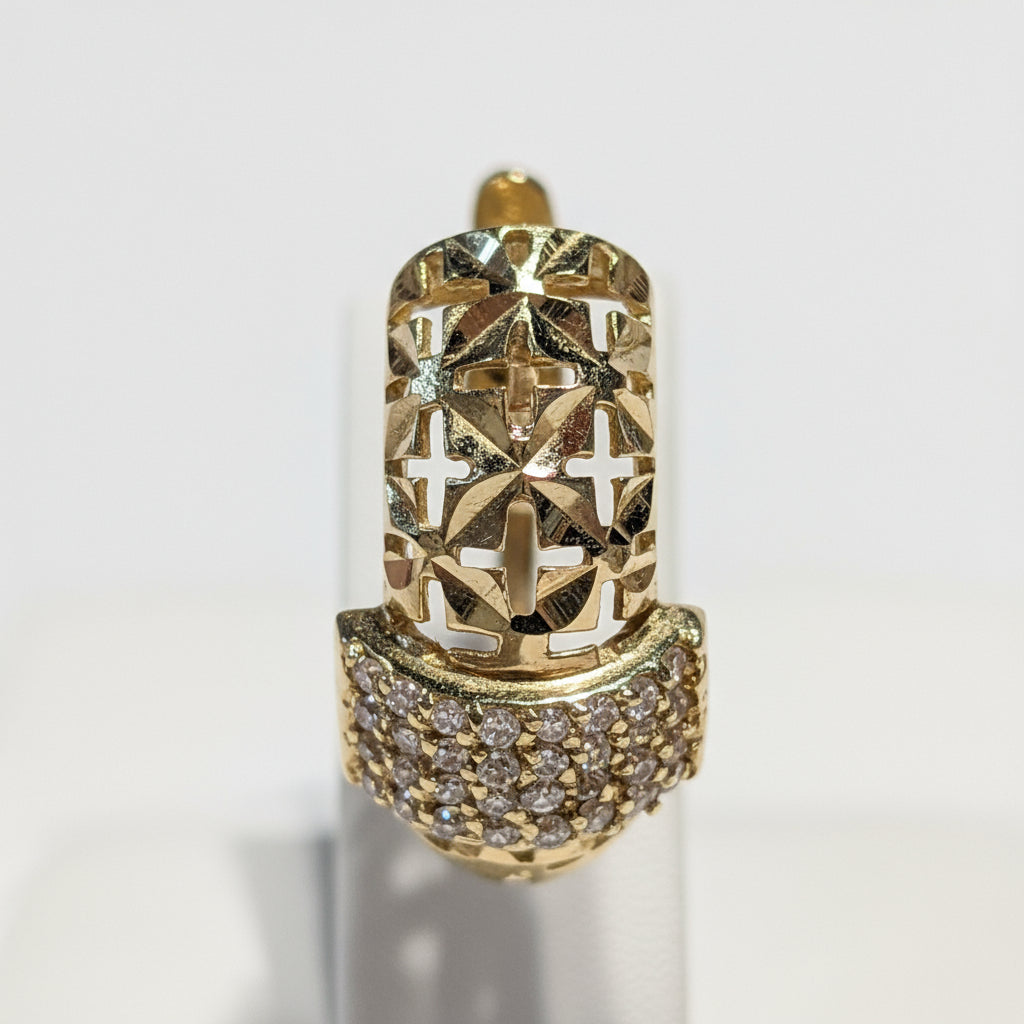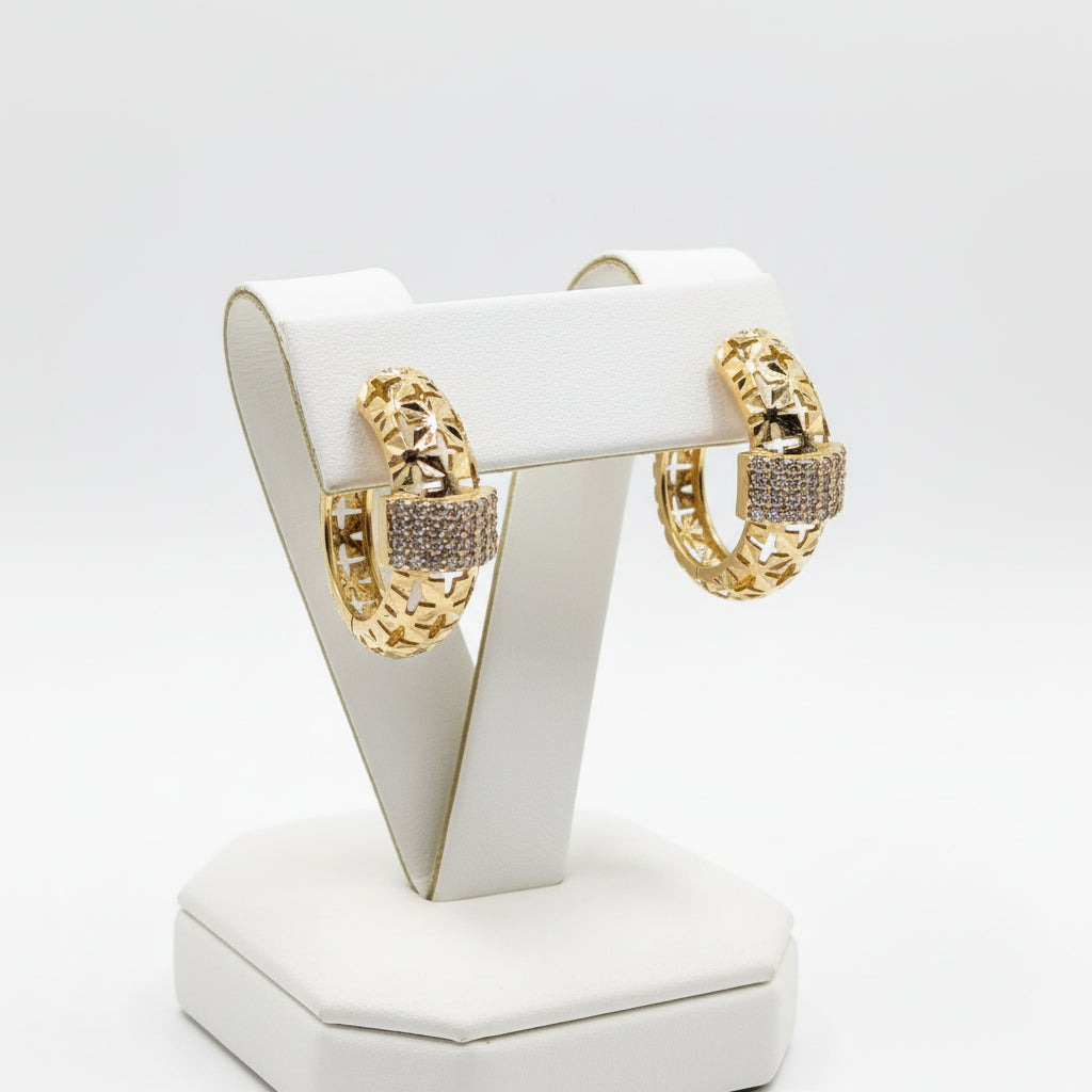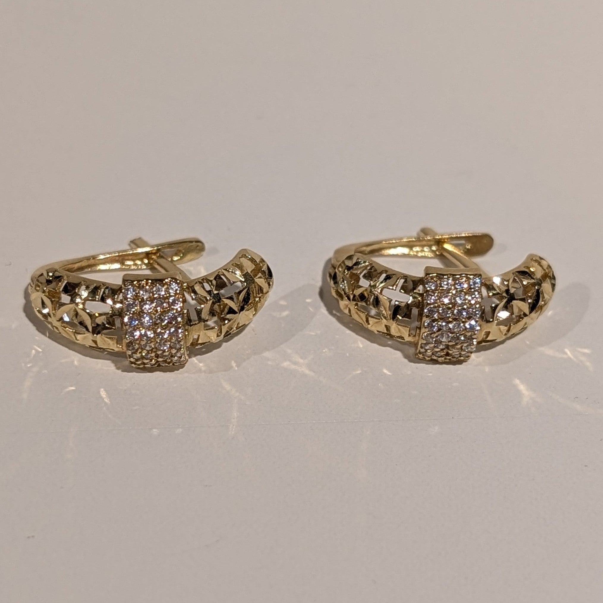 Boucles dormeuses en or jaune 750/1000 (18 carats), sans poinçon. Serties de 32 éclats d’oxydes par boucle. Dimensions : 2 × 0,7 × 0,2 cm. Poids total : 3,64 g. En très bon état.