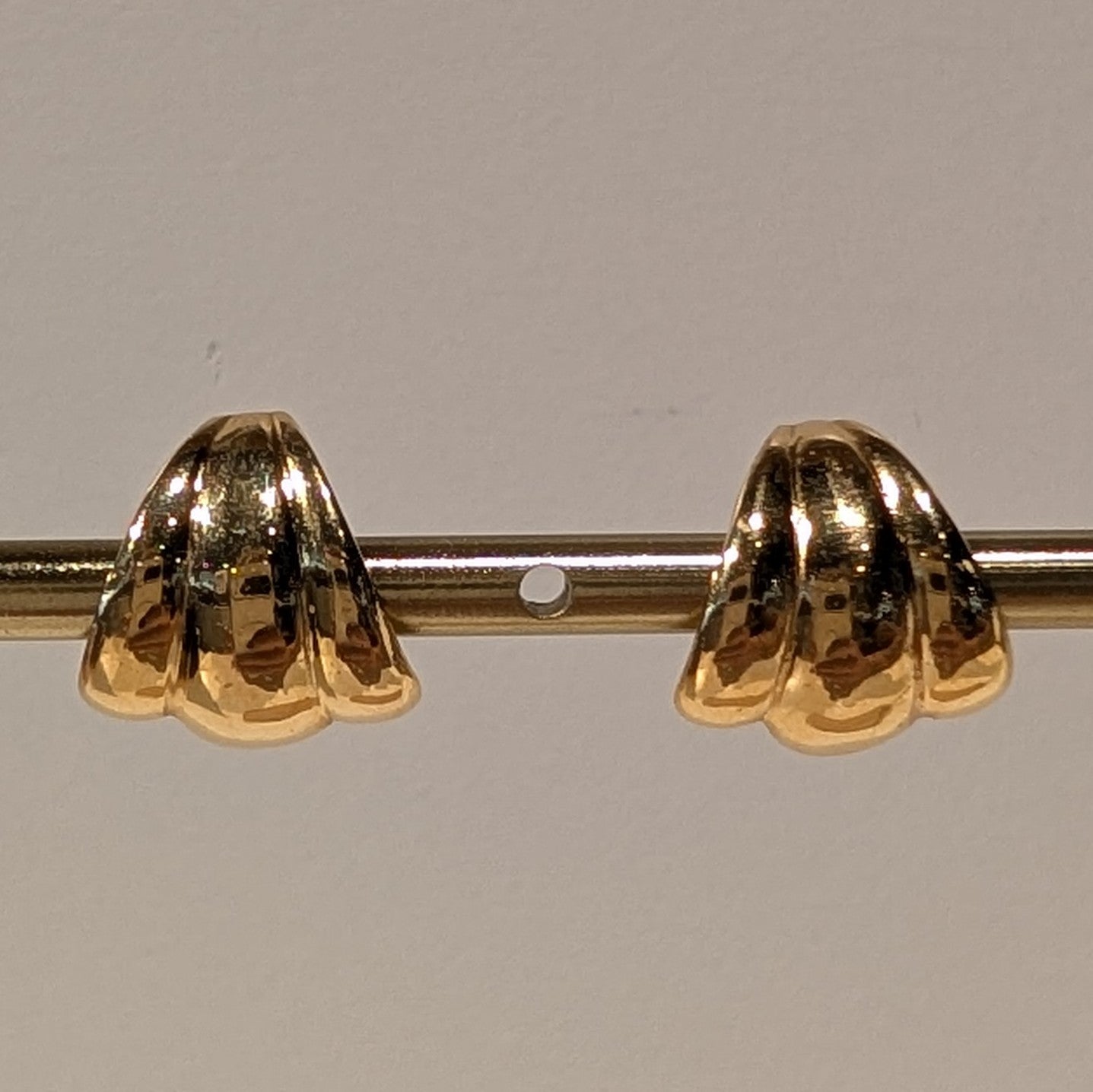 Boucles d’oreilles de type clou sont réalisées en or jaune 18 carats (titrage 750/1000), sans poinçon. Elles mesurent 1 cm de hauteur, 1,5 cm de largeur et 0,1 cm d’épaisseur, pour un poids total de 3,33 grammes. Dotées d’un fermoir à poussettes, elles sont en bon état.