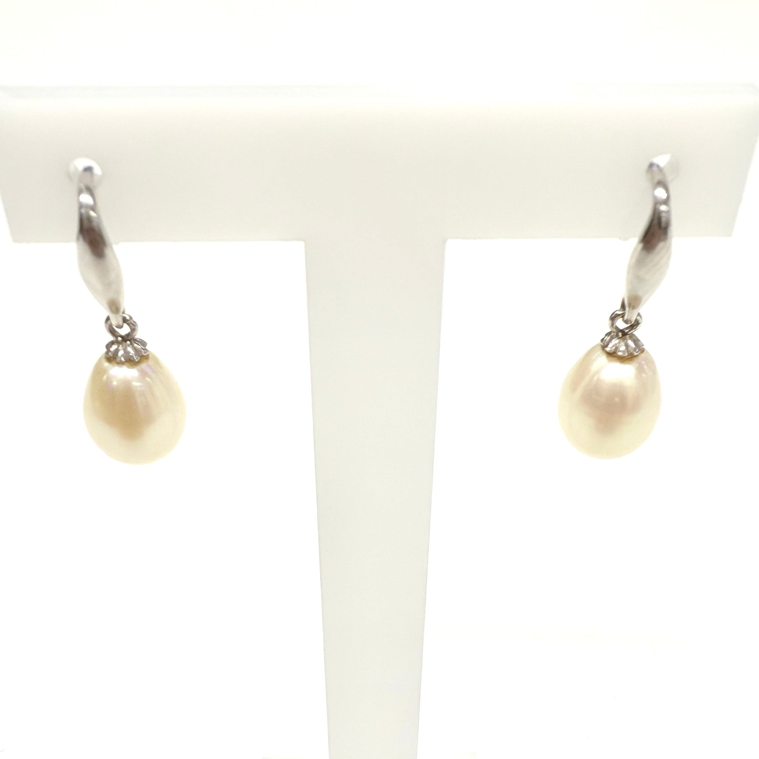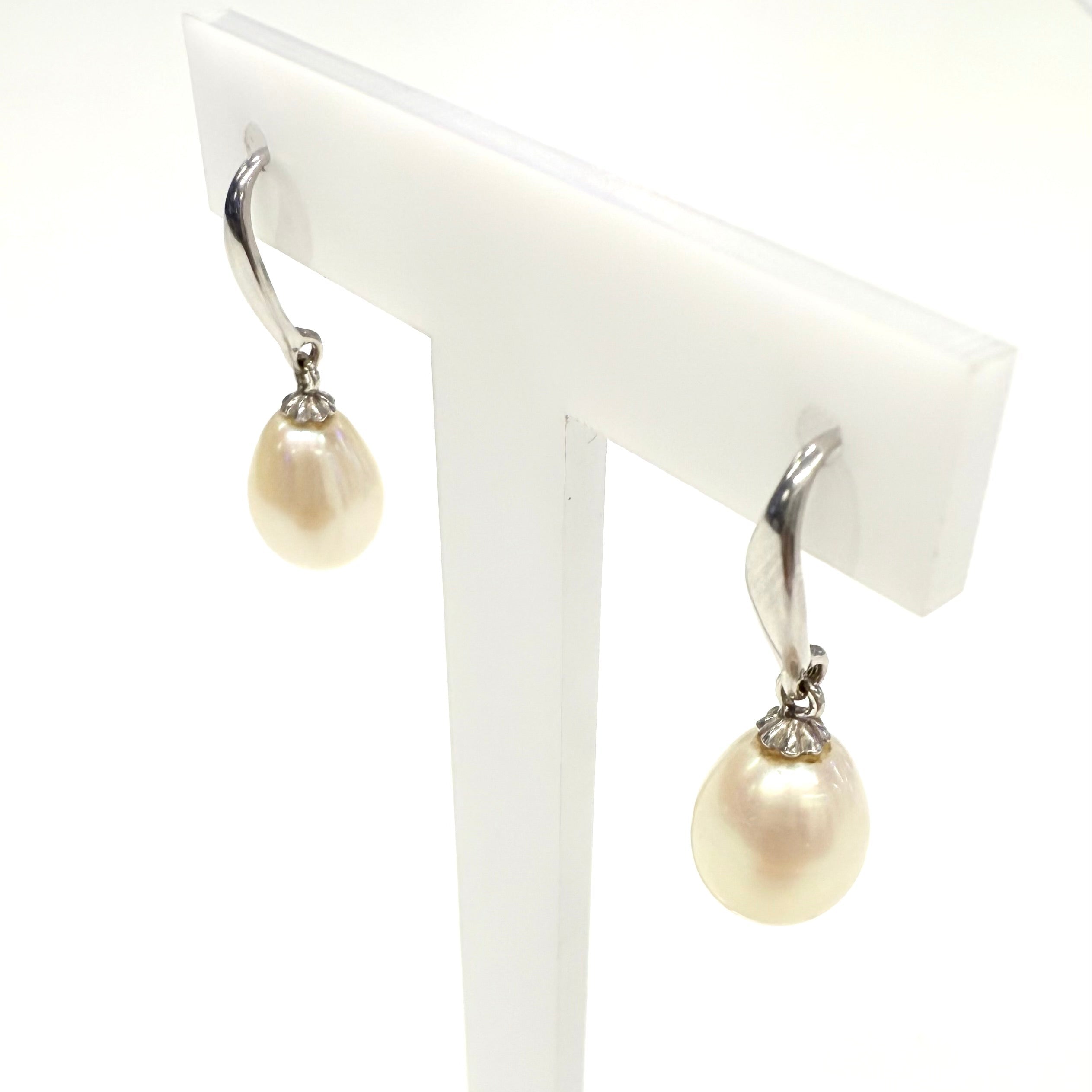Boucles d’oreilles à crochets en or blanc 18 carats (750/1000) arborent deux perles d’eau douce pour une touche de raffinement discret. Mesurant 2,5 cm de hauteur pour 0,8 cm de largeur, elles offrent un porté élégant et léger avec un poids total de 2,96 grammes. Sans poinçon mais en très bon état