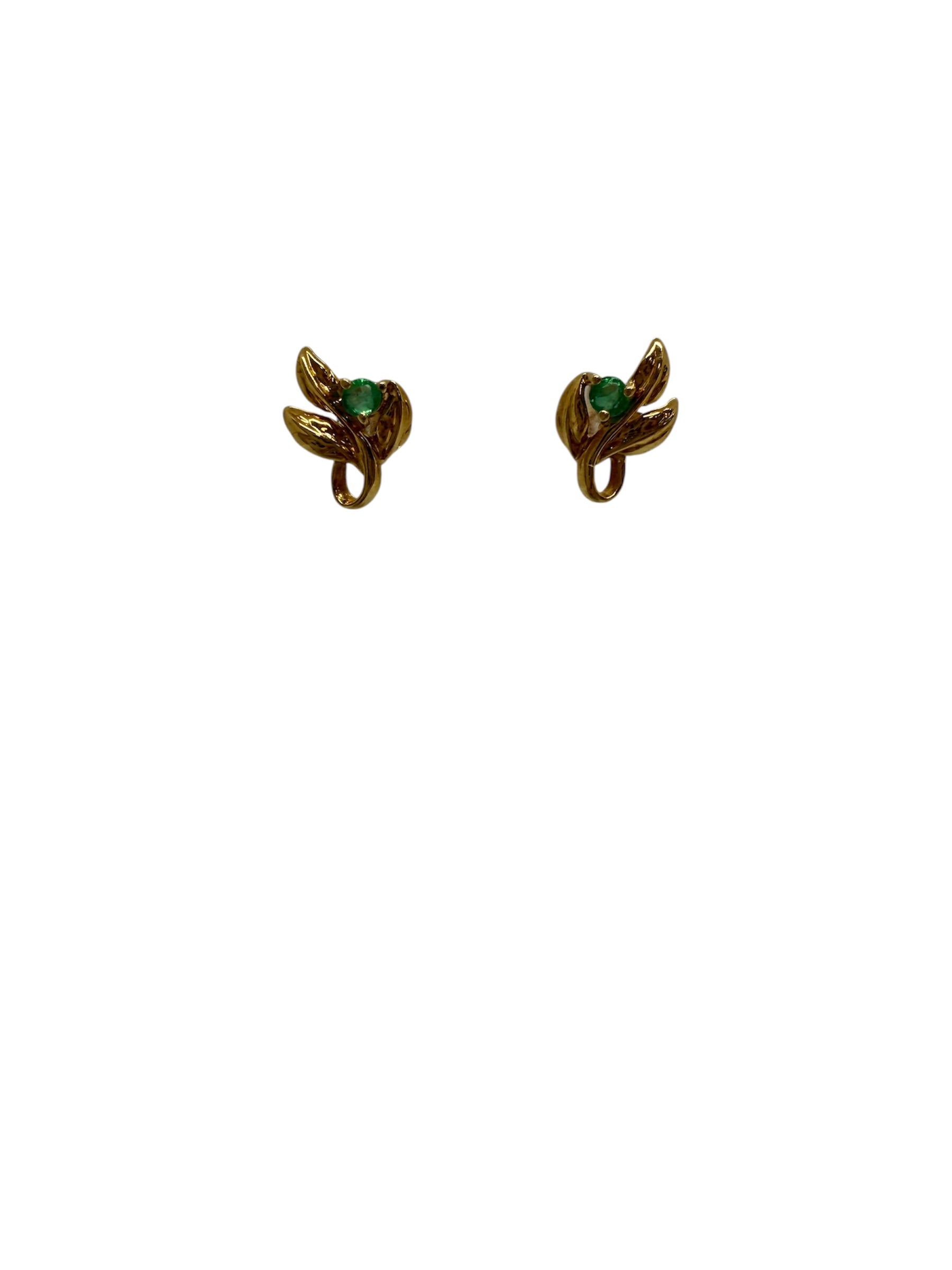 Paire de boucles d’oreilles de type clou en or jaune 18 carats (750/1000), sans poinçon, avec fermoirs à poussettes. Chaque boucle mesure 7 mm de hauteur, 6 mm de largeur et 1 mm d’épaisseur, pour un poids total de 0,96 gramme. Elles sont ornées de deux émeraudes de 0,02 carat chacune. Le bijou est en très bon état.