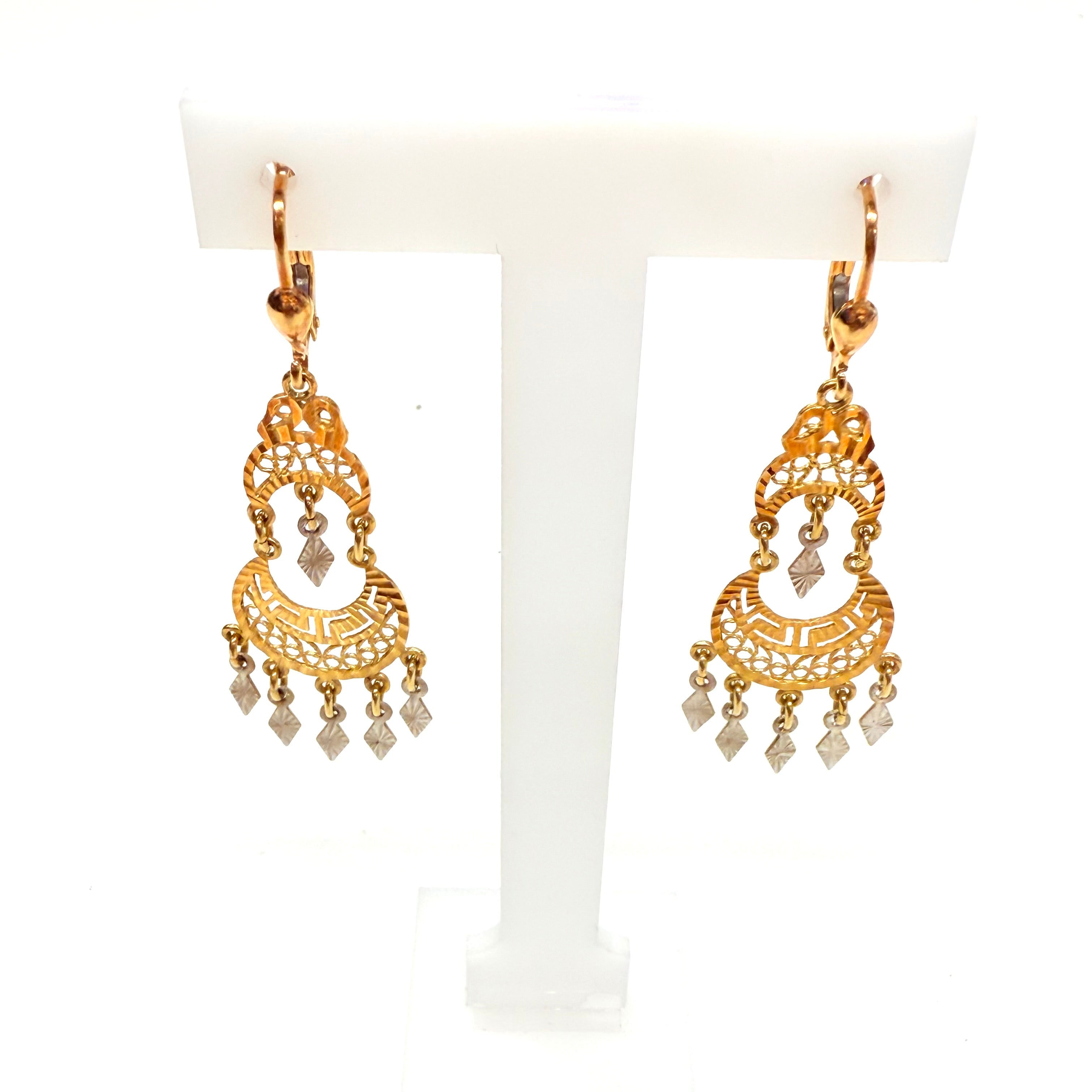 Boucles d’oreilles savoyardes en or jaune et or blanc 18 carats (750/1000), sans poinçon, avec fermoirs dormeuses. Elles mesurent 5,3 cm de hauteur pour un poids total de 4,97 g. Modèle sans pierres, en très bon état.