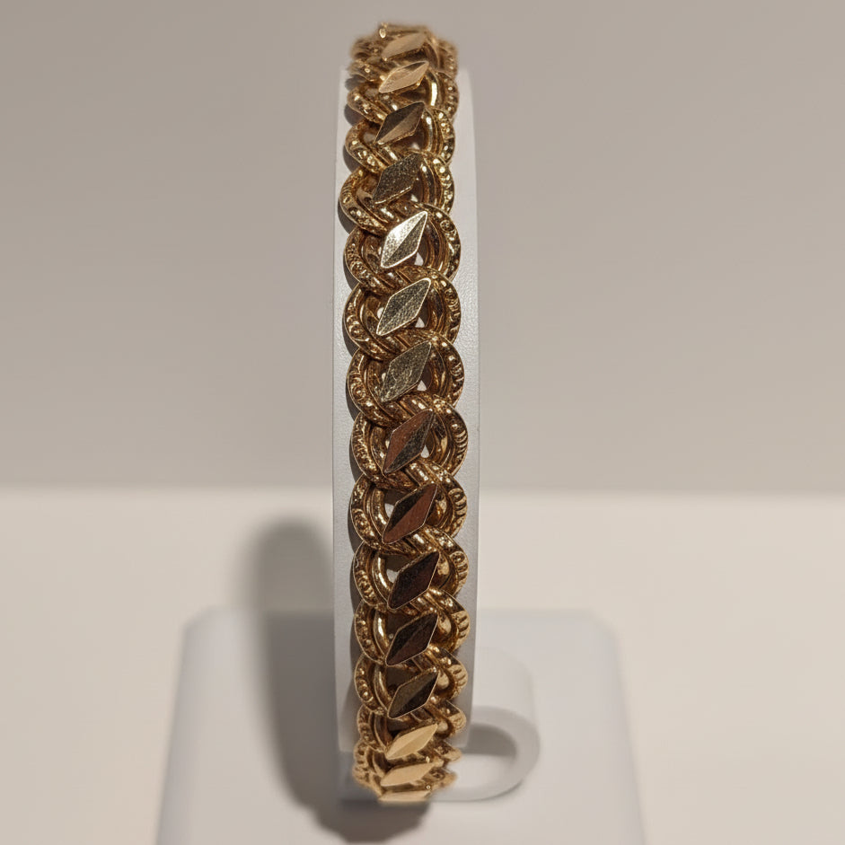 Bracelet gourmette en or jaune 18K, maille américaine, longueur 20 cm, poids 18,12 g. Poinçon 750 et fermoir à cliquet offrant sécurité et solidité. Avec sa largeur de 1 cm et son épaisseur de 0,5 cm, il présente une belle présence au poignet. En très bon état, c’est un bijou élégant et durable.