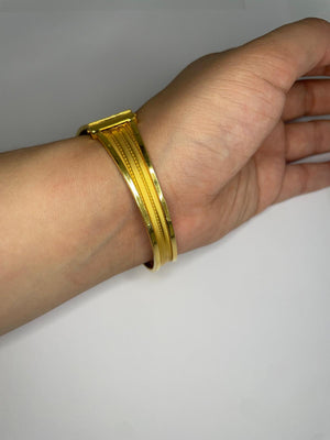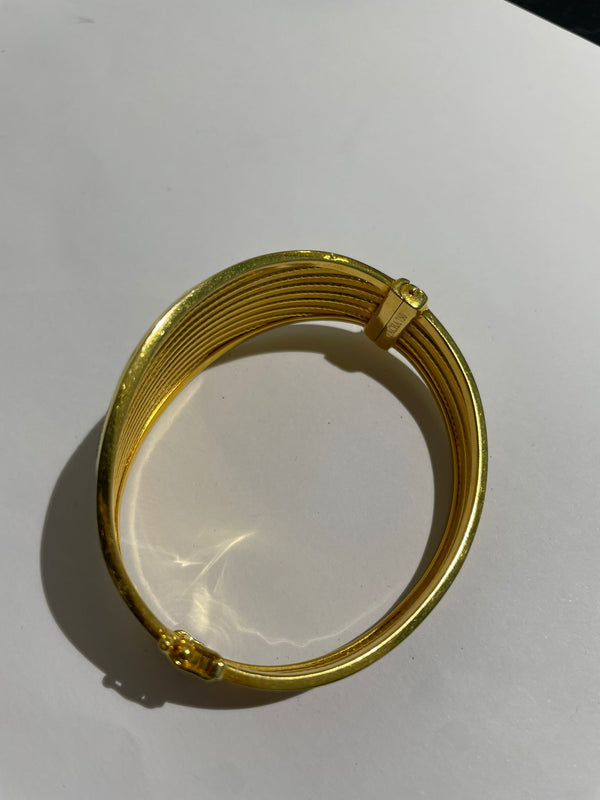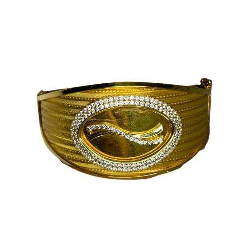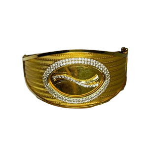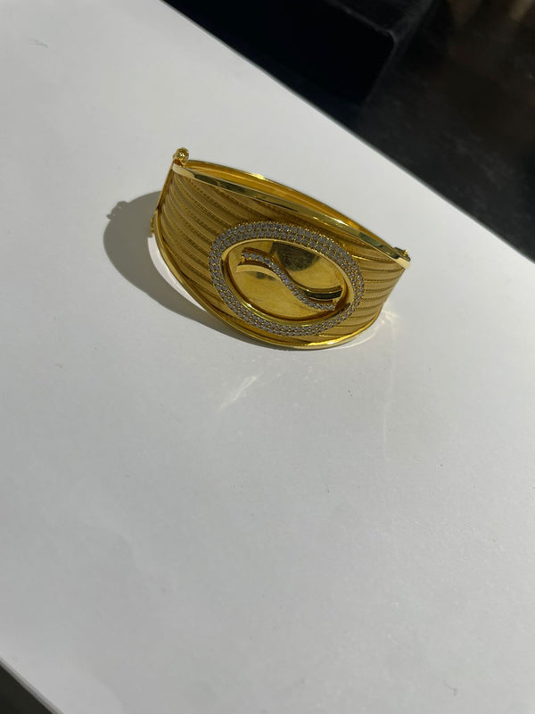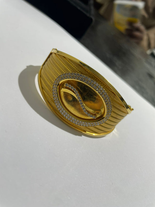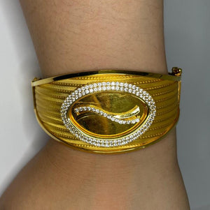 Bracelet jonc en or jaune 18 carats (750/1000), sans maille, doté d’un fermoir à cliquet discret. Ce modèle, sans poinçon, affiche un poids de 31 grammes et intègre des oxydes de zirconium en guise d’ornement. Ses dimensions sont de 6,5 cm de long, 5,5 cm de large et 0,3 cm d’épaisseur. État : Bon.