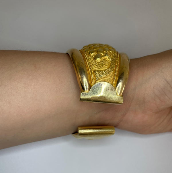 Bracelet jonc en or jaune 18 carats (750/1000), sans maille ni fermoir, au design rigide et épuré. Ce bijou sans poinçon pèse 52,1 grammes et mesure 6 cm de long pour 5,5 cm de large, avec une épaisseur de 0,5 cm. Il ne comporte aucune pierre. État : Bon.