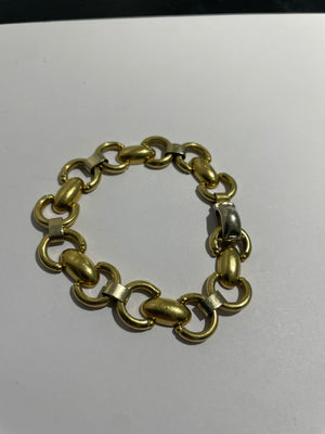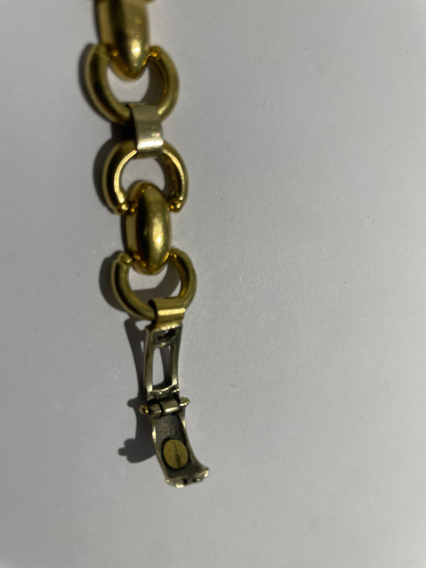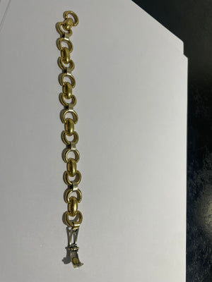 Bracelet à maillons en or jaune 18 carats (750/1000) avec maille jaseron. Il pèse 19,19 grammes et mesure 18 cm de longueur, 5,5 cm de largeur, pour une épaisseur de 0,3 cm. Le fermoir est de type à cliquet. Ce bracelet ne comporte pas de pierres et est en bon état.