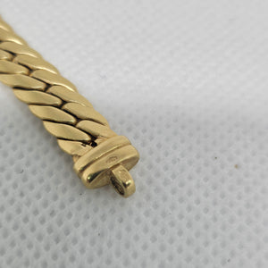 Bracelet à maillons de type maille anglaise est réalisé en or jaune 18 carats (750/1000) et porte le poinçon tête d’aigle. Il mesure 19 cm de long, 0,5 cm de large et 0,1 cm d’épaisseur, pour un poids de 11 grammes. Dépourvu de pierres, il est doté d’un fermoir mousqueton et se trouve en très bon état.