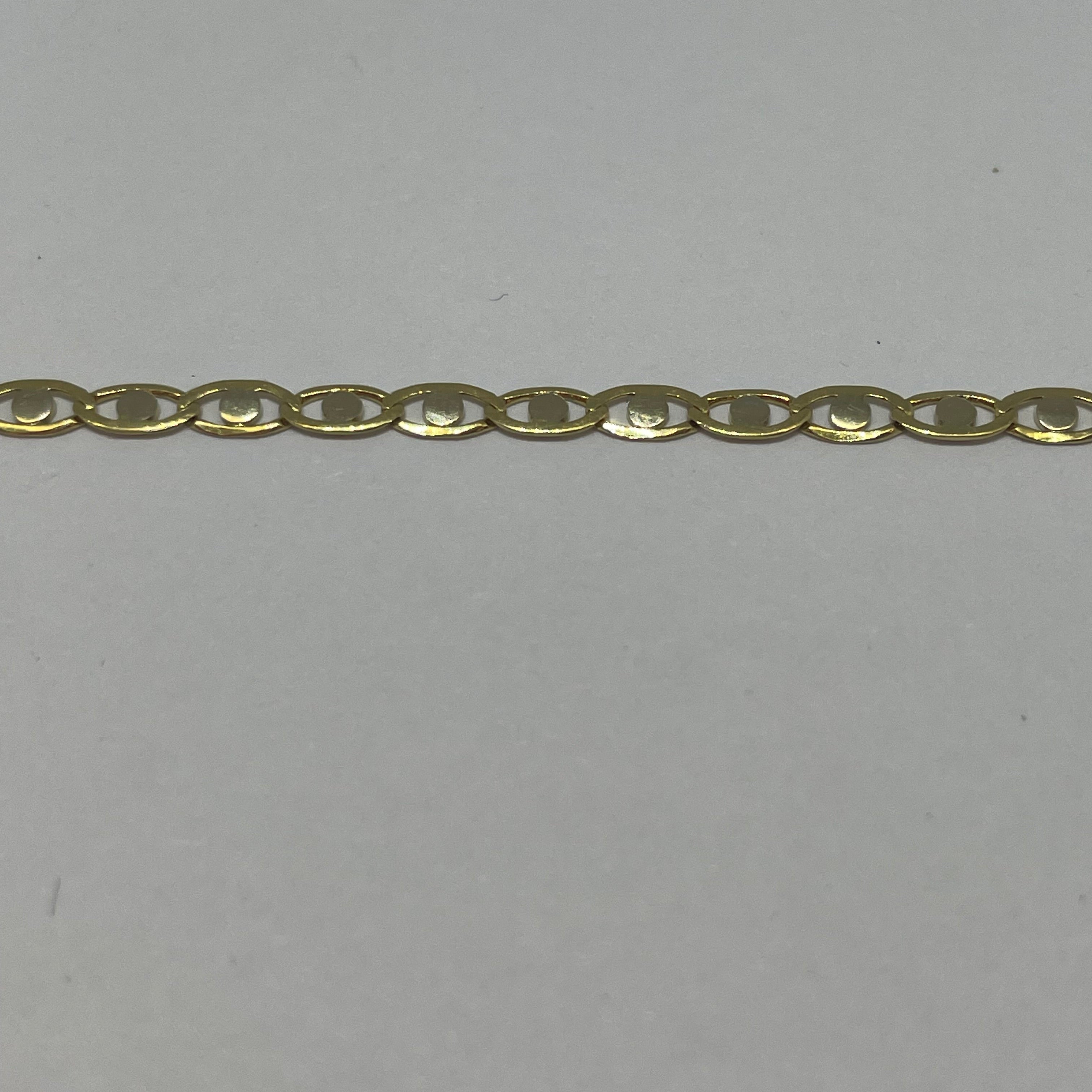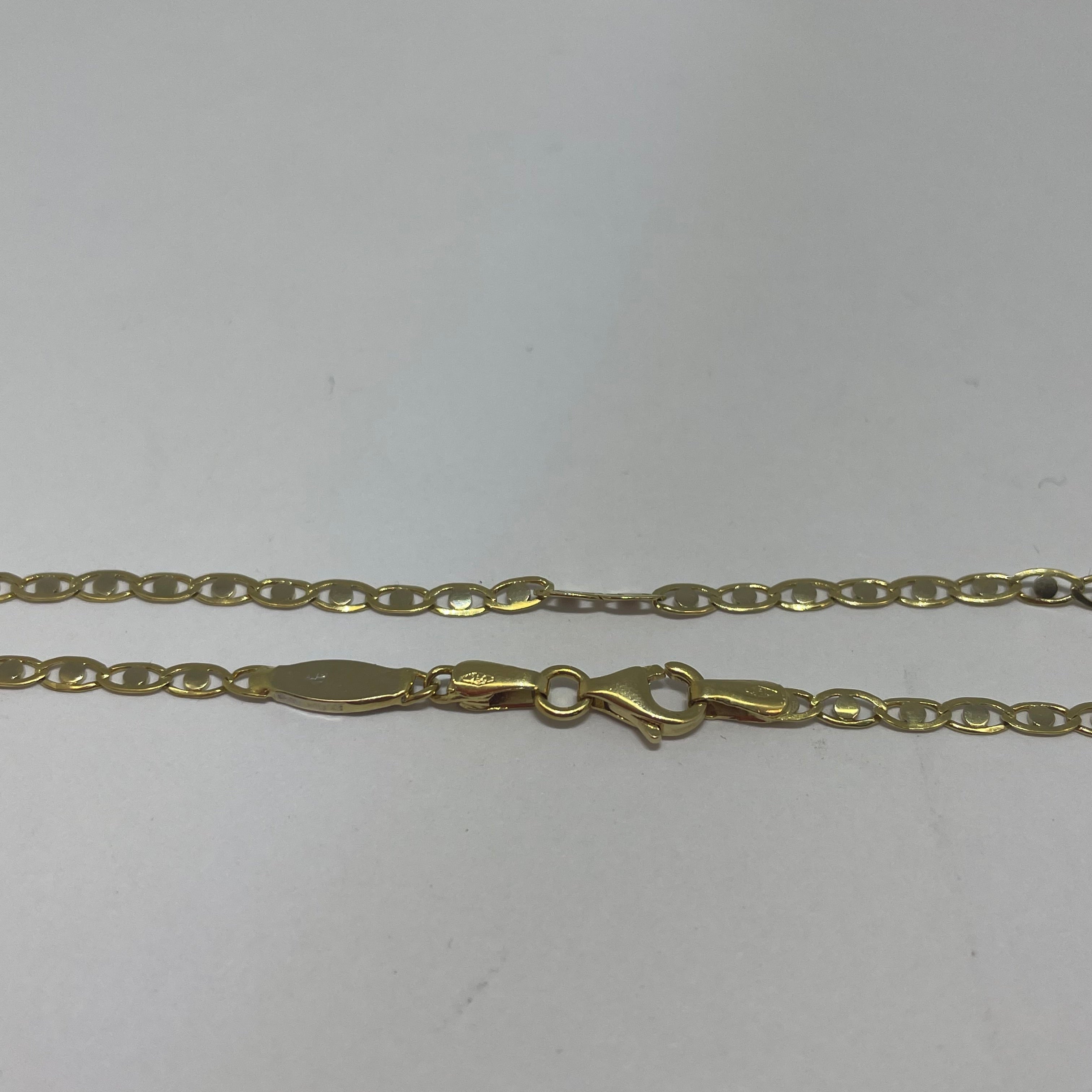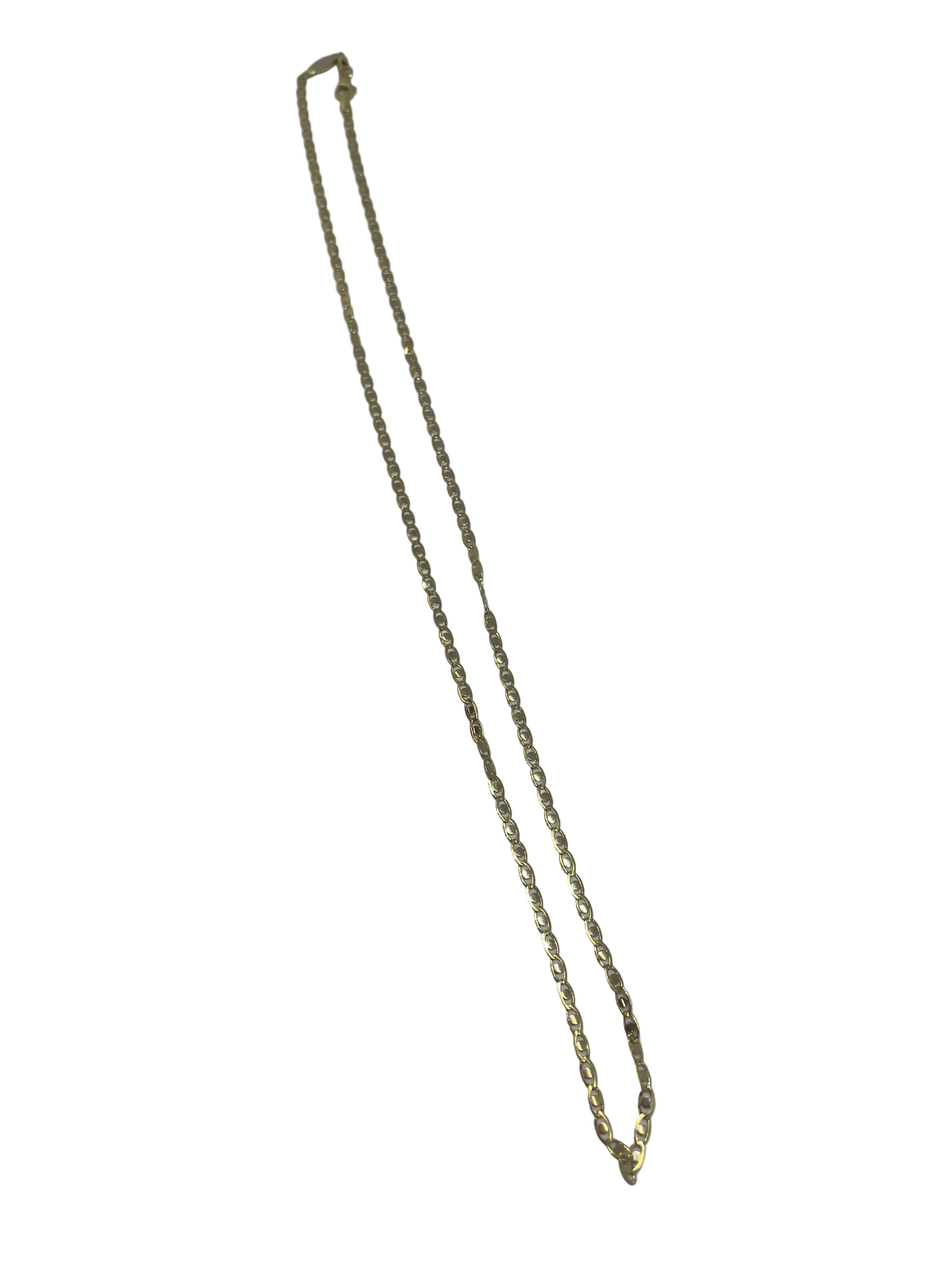 Ce collier matinée en or jaune 750/1000, à maille cheval et doté d’un fermoir mousqueton, est poinçonné 750 et pèse 5,24 g. Il mesure 49,5 cm de longueur, 2 mm de largeur et 0,1 mm d’épaisseur.