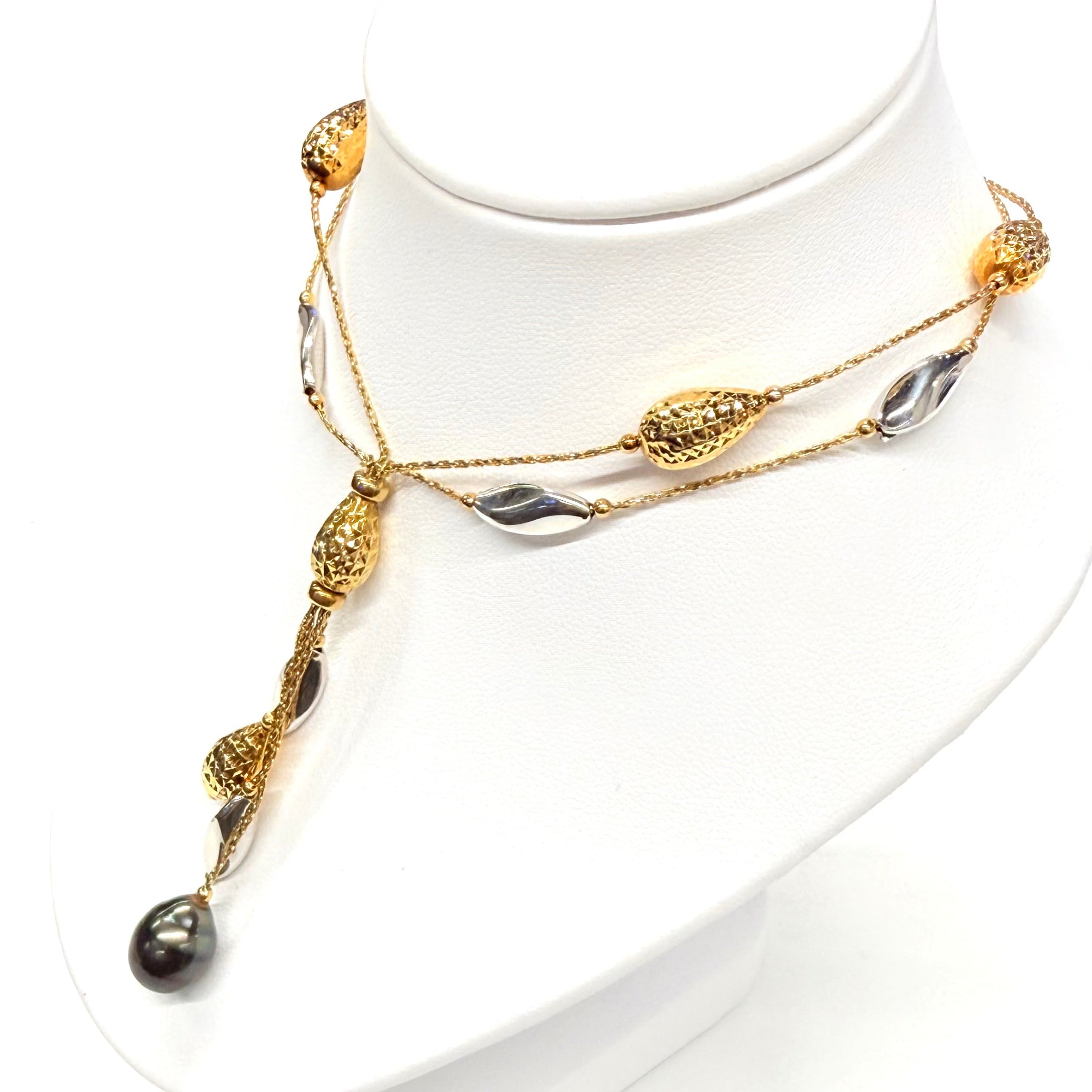 Collier matinée raffiné en or jaune et or blanc 750/1000, réalisé en maille vénitienne élégante. Il est orné d’une perle de Tahiti de 0,9 cm de diamètre et 1,1 cm de longueur, suspendue à un pendentif breloque de 6 cm.