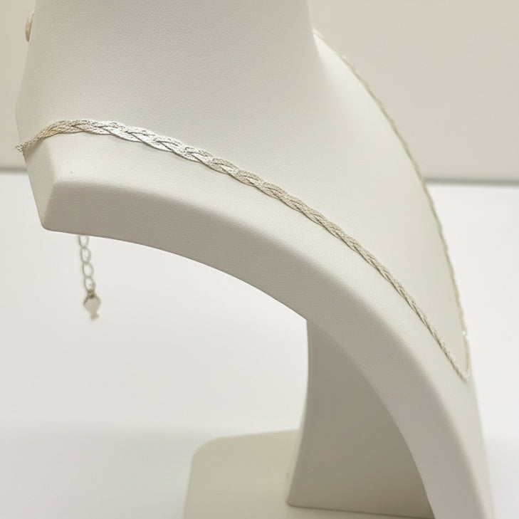 Collier ras du cou en or blanc 18K, maille tressée, longueur 42 cm, largeur et épaisseur 1 mm, poids 4,78 g. Poinçon 750, fermoir mousqueton. En bon état, un bijou fin et élégant, idéal pour un porté quotidien ou en superposition.