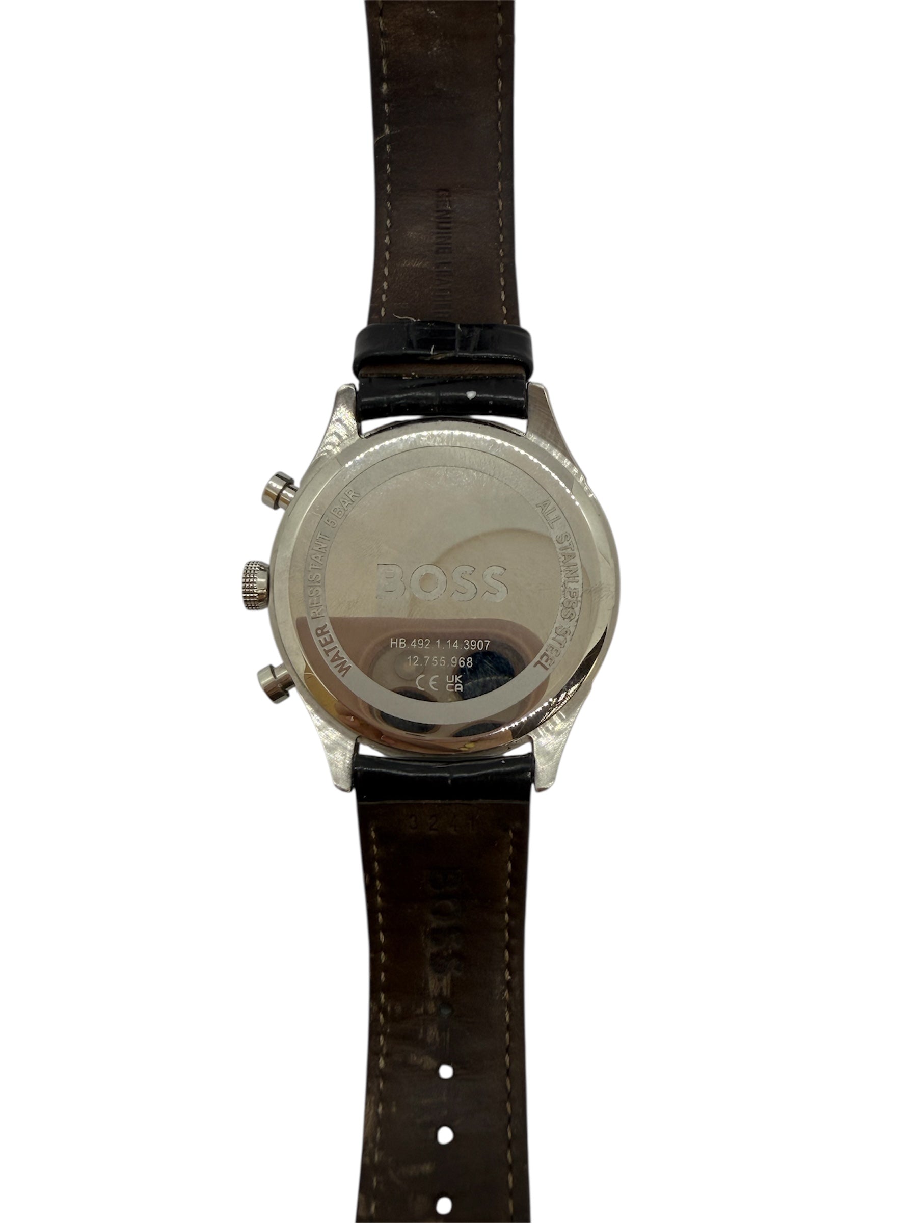 Montre Hugo Boss classique, modèle de 2021, en très bon état. Il s’agit d’une montre moderne à affichage analogique, dotée d’un mouvement à quartz. Le boîtier en acier mesure 44 mm de diamètre pour 11 mm d’épaisseur, avec un verre minéral. La couleur du boîtier est acier. Le bracelet en cuir, équipé d’une boucle ardillon, a une largeur de 19 mm.