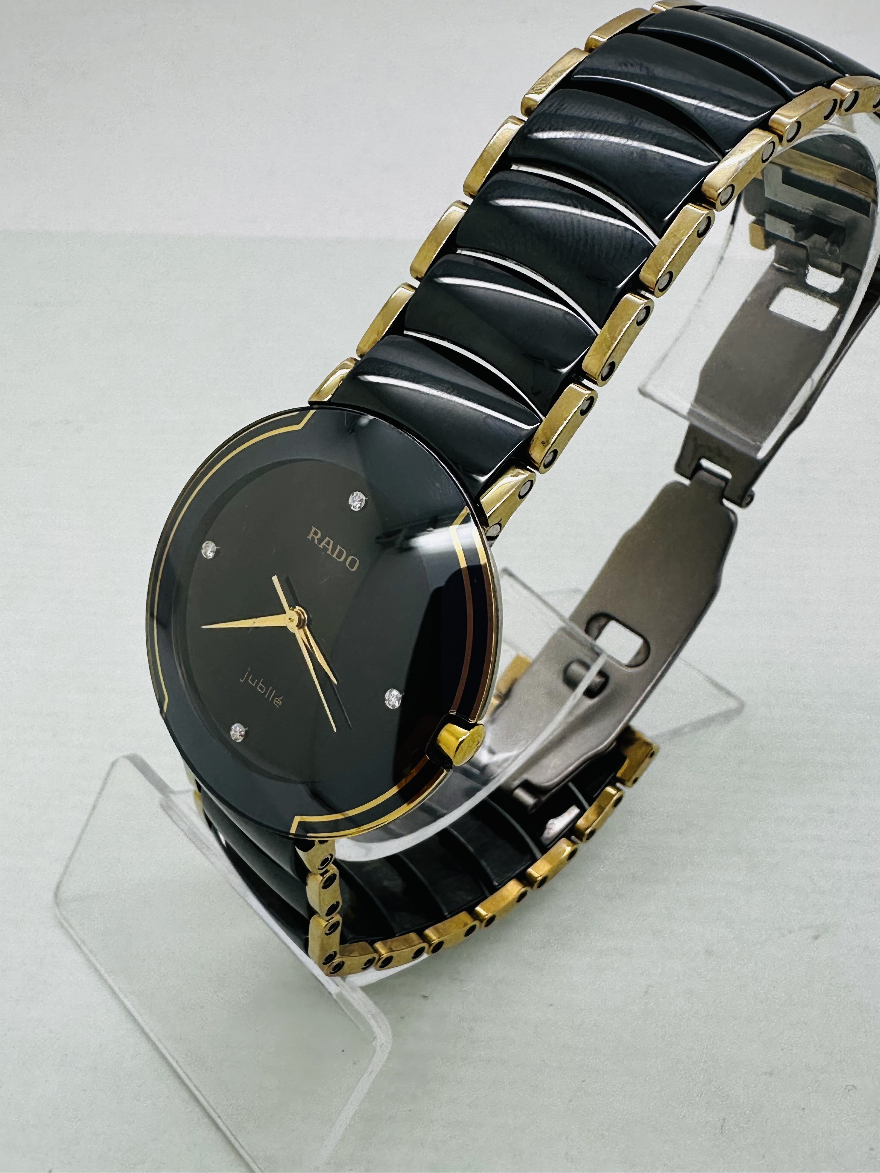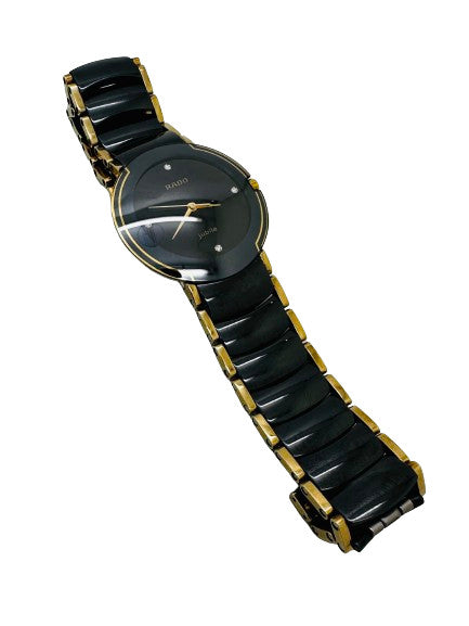 Élégante montre Rado en céramique noir et doré, ornée de 4 diamants