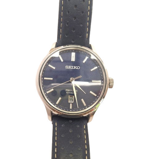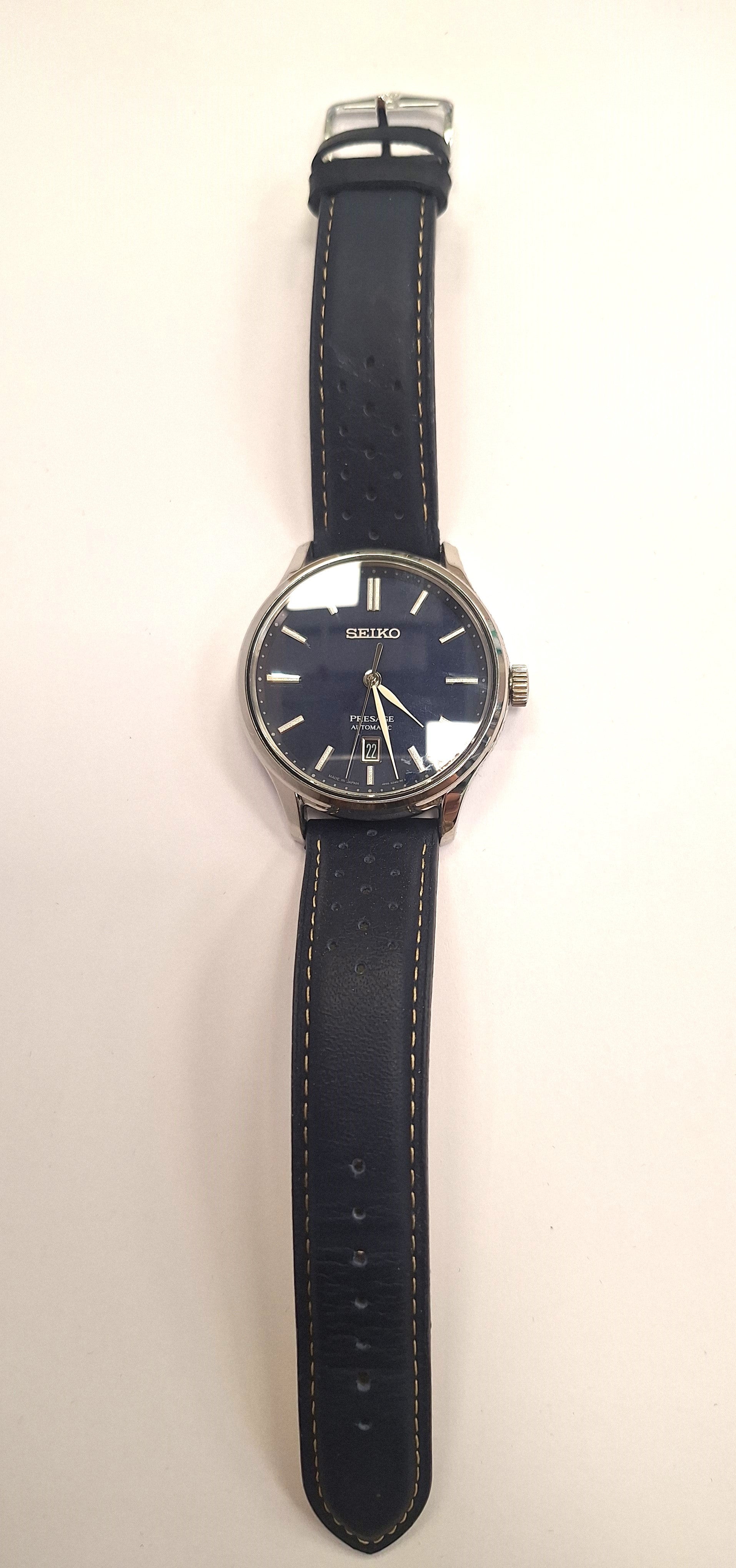 Magnifique montre présage automatique seul temps inspiré des jardins japonais monté sur un bracelet en cuir fait main de couleur bleu (assorti au cadran) vendu avec son bracelet en acier d'origine, sa boite, sa notice, et son certificat.