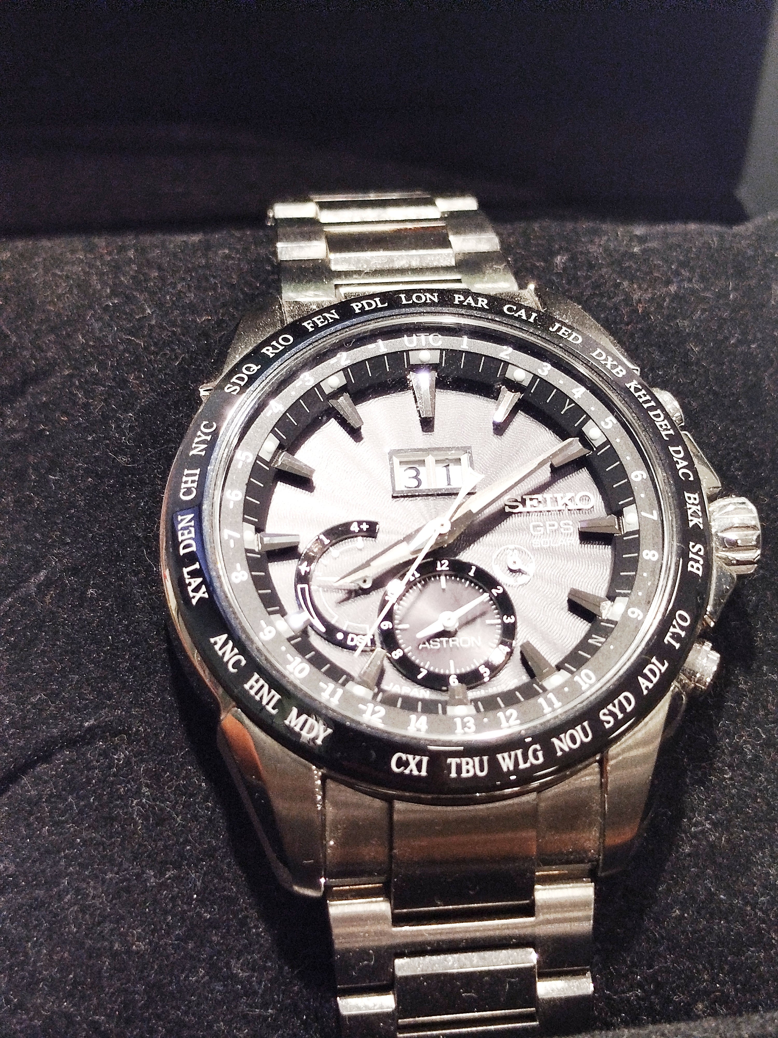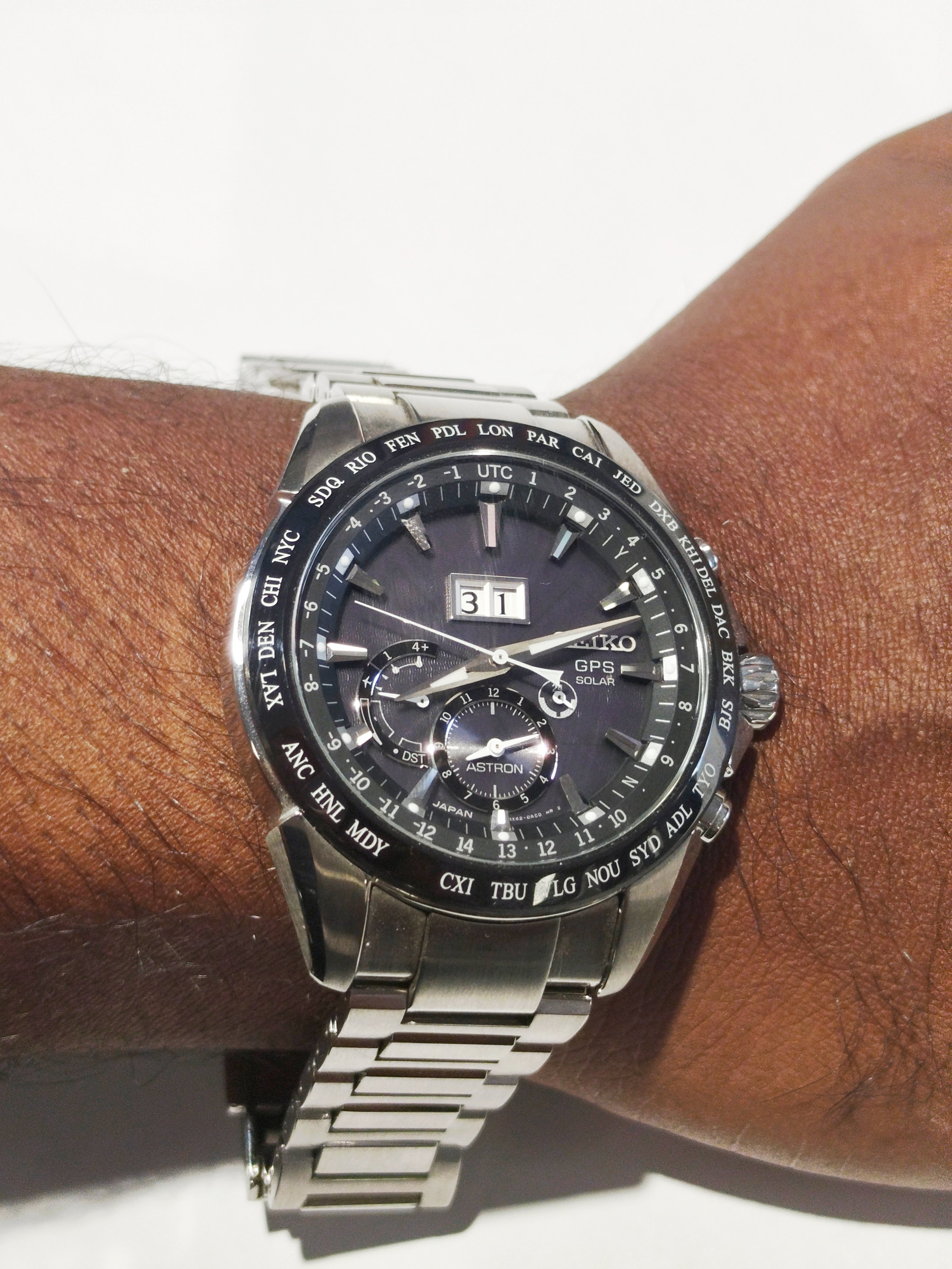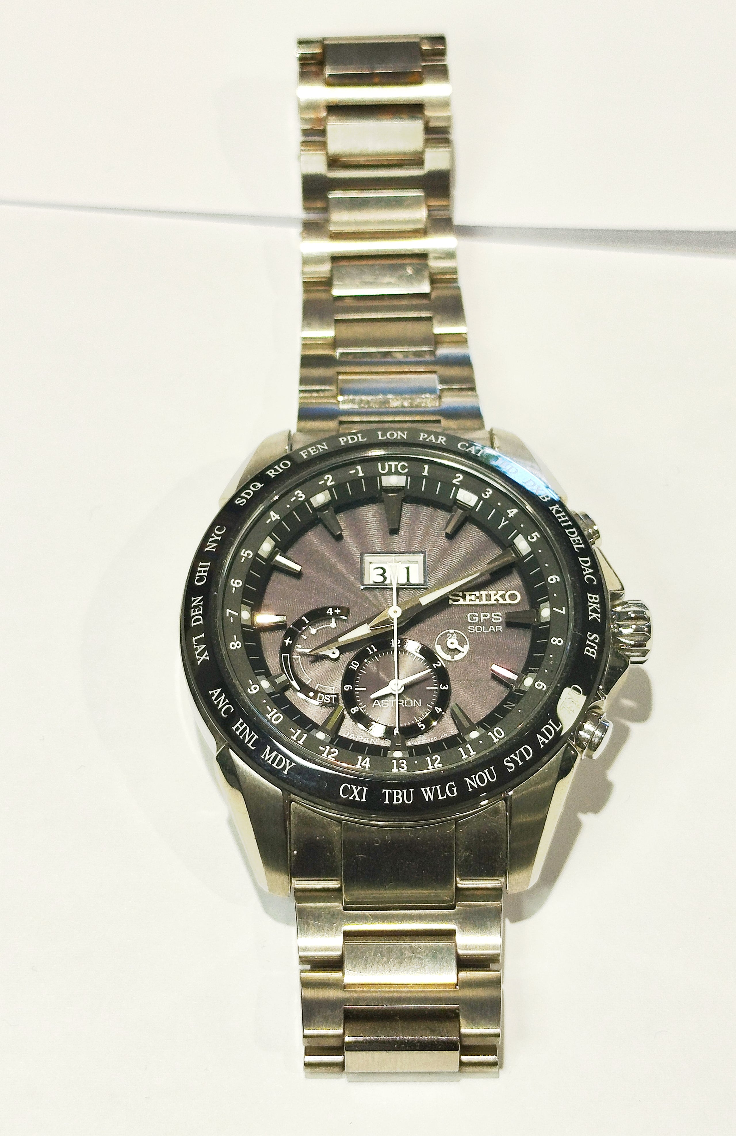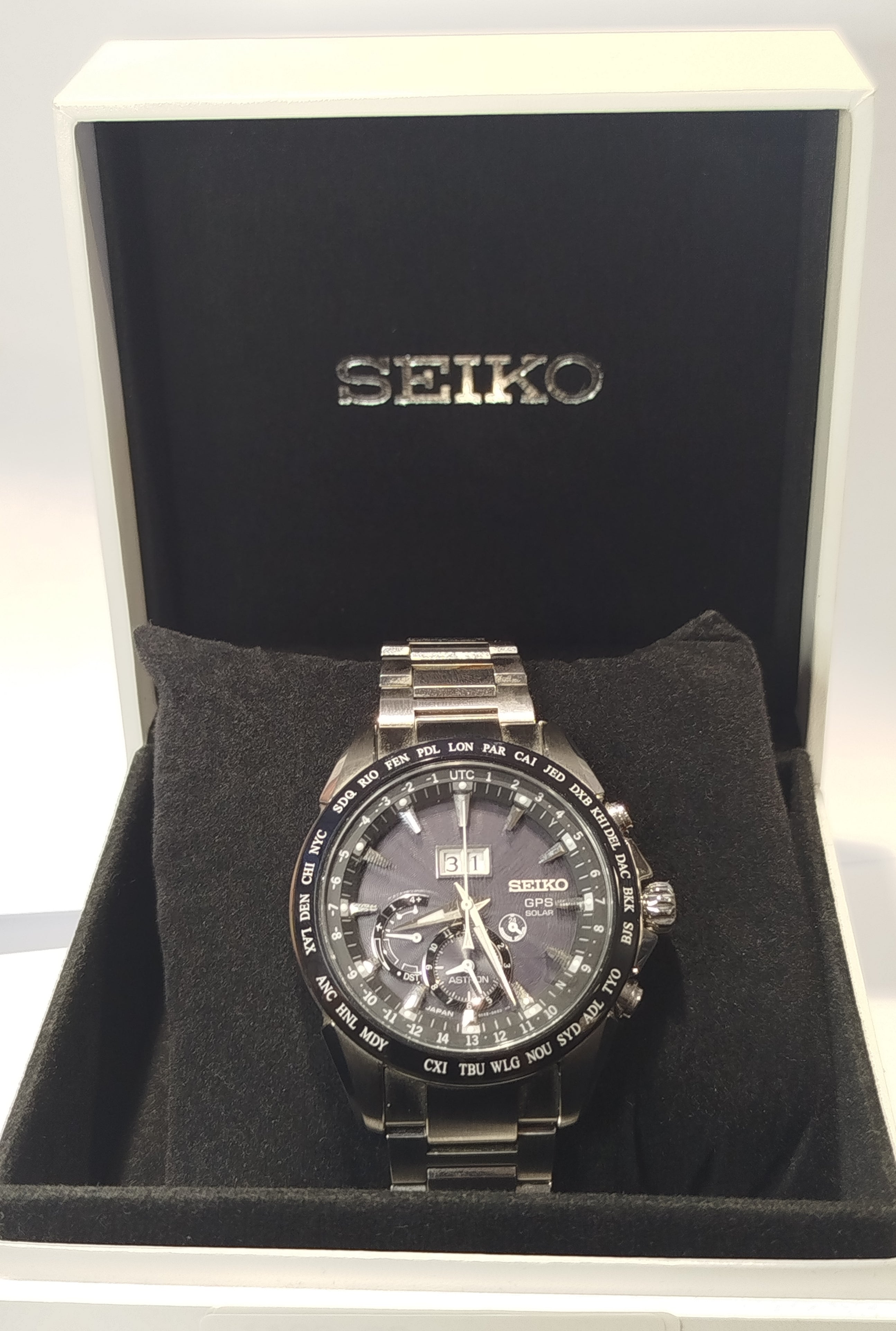 Montre Seiko Astron SBX149, modèle chronographe à mouvement quartz, datant de 2010, en très bon état. Elle dispose d’un boîtier en acier noir de 4,5 cm de diamètre et 1 cm d’épaisseur, protégé par un verre saphir. Le bracelet en acier Oyster, d’une largeur de 1,5 cm, est équipé d’un fermoir papillon à boucle invisible. L’affichage est analogique, combinant élégance et précision.