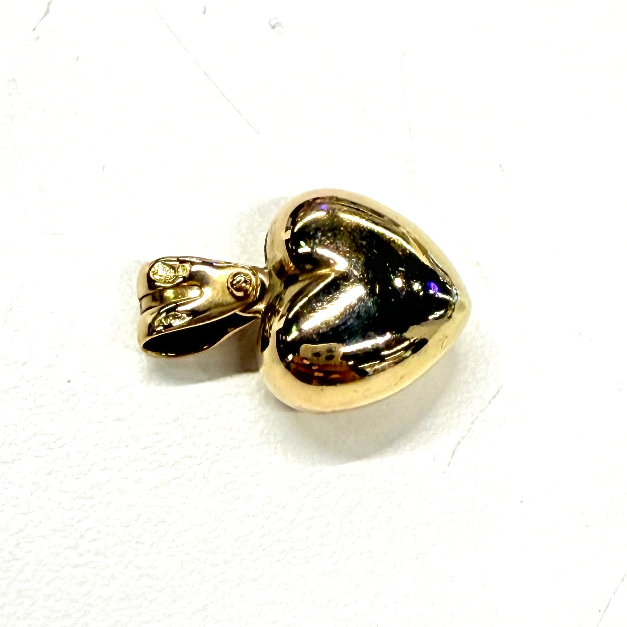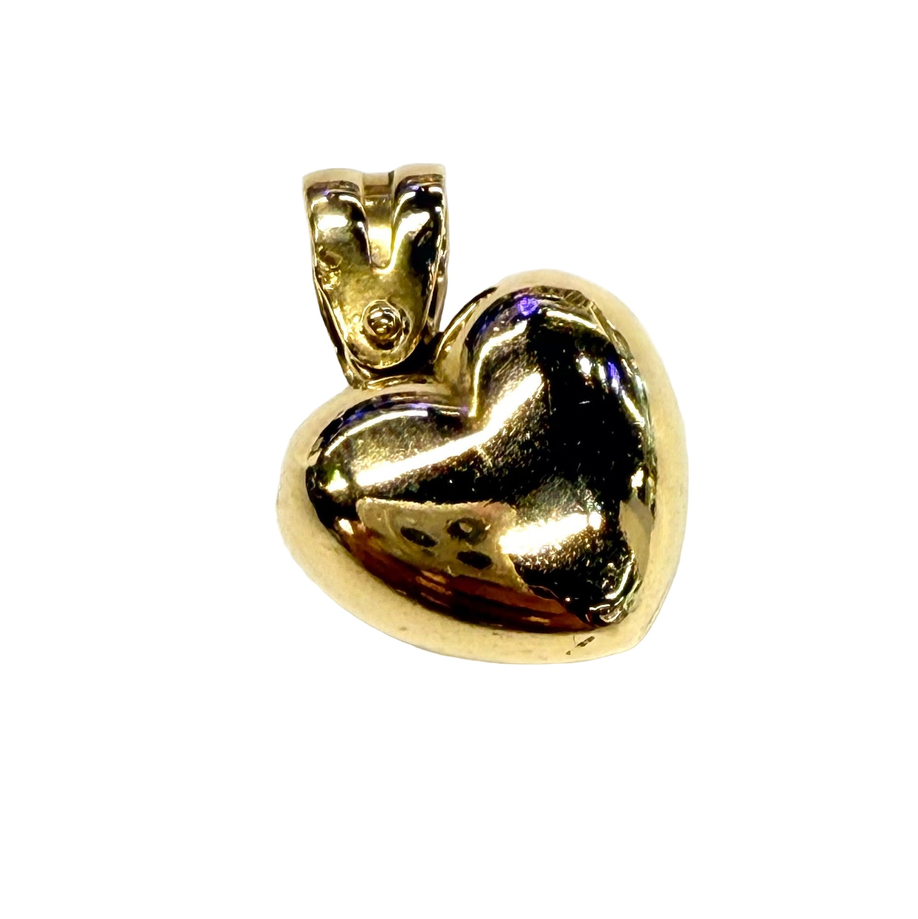 Pendentif cœur en or jaune 750/1000 (18 carats), poinçon 750, poids 1,45 g. Dimensions : 1,5 × 1 × 0,5 cm. Modèle sans pierre, orné d’un oxyde de zirconium pour plus de brillance. En très bon état.